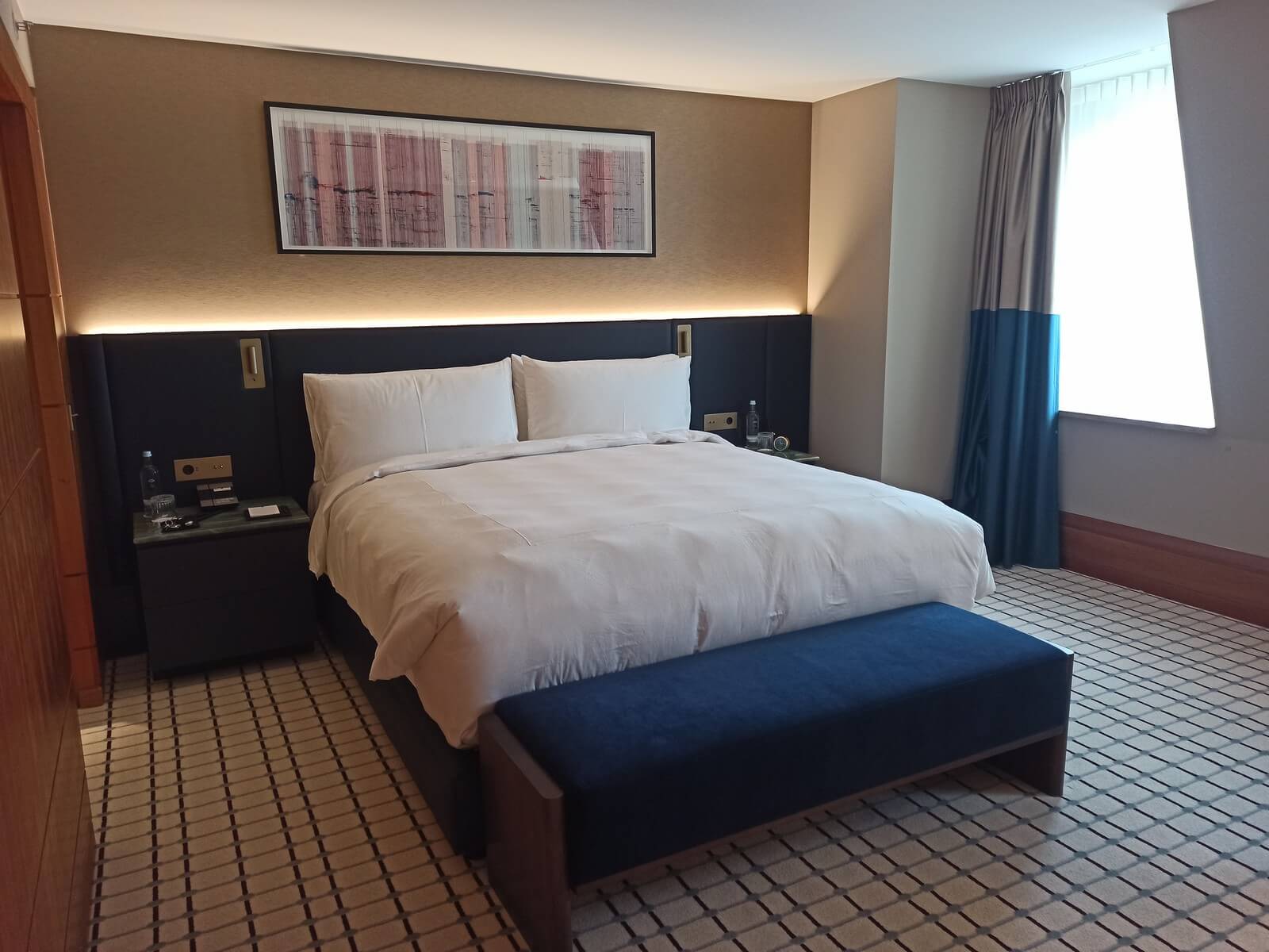Das Conrad Hamburg bietet insgesamt 283 Zimmer und Suiten, die sich auf 14 verschiedene Kategorien verteilen. Das Hotel bietet die größte Präsidenten-Suite der Stadt (231 qm), die über zwei Schlafzimmer, eine kleine Küche und eine eigene Sauna verfügt. Ich war in einem King Premier Room eingebucht, der eine angenehme Größe von 40 Quadratmetern ausweist. Das Bad kann durch zwei Schiebetüren vom restlichen Zimmer abgetrennt werden. Toilette und Bad sind voneinander separiert. Der King Premier Room bietet den Gästen neben einer Minibar auch eine Kapsel-Kaffeemaschine, ein Bad mit begehbarer Regendusche und separater Badewanne, Bademäntel, Hausschuhe, einen Safe, einen Schirm, ein Bügelbrett und Bügeleisen sowie Amenities im Badezimmer. Auf jedem Nachttisch sind eine Steckdose sowie zwei USB-C-Anschlüsse angebracht. Auf dem kleinen Tisch wartete ein Welcome-Amenity und eine Grußkarte des Hotelteams auf mich.