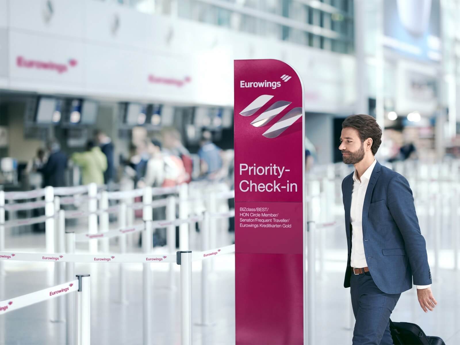 Eurowings folge lange dem Konzept eines Low-Cost-Carriers, doch in manchen Punkten setzt man sich von den Billigfliegern ab. So bietet Eurowings den Passagieren zwei Reiseklassen (Economy Class und Business Class) und verschiedene Tarife in diesen Reiseklassen an. Dadurch profitieren Business Class Passagiere von einem Priority-Check-In und -Boarding, erhalten mehr Hand- und Aufgabegepäck und haben Zugang zu Lounges der Lufthansa Group (Miles & More Statusvorteile bei Eurowings). Im Herbst 2025 wird Eurowings zudem einen neuen Premium Business-Sitz auf längeren Mittelstrecken einführen. Es handelt sich hierbei um einen Recliner-Sitz des italienischen Herstellers Geven. Der Sessel ist breiter und verfügt über eine ausfahrbare Bein- und Fußablage sowie eine verstellbare Rückenlehne.
