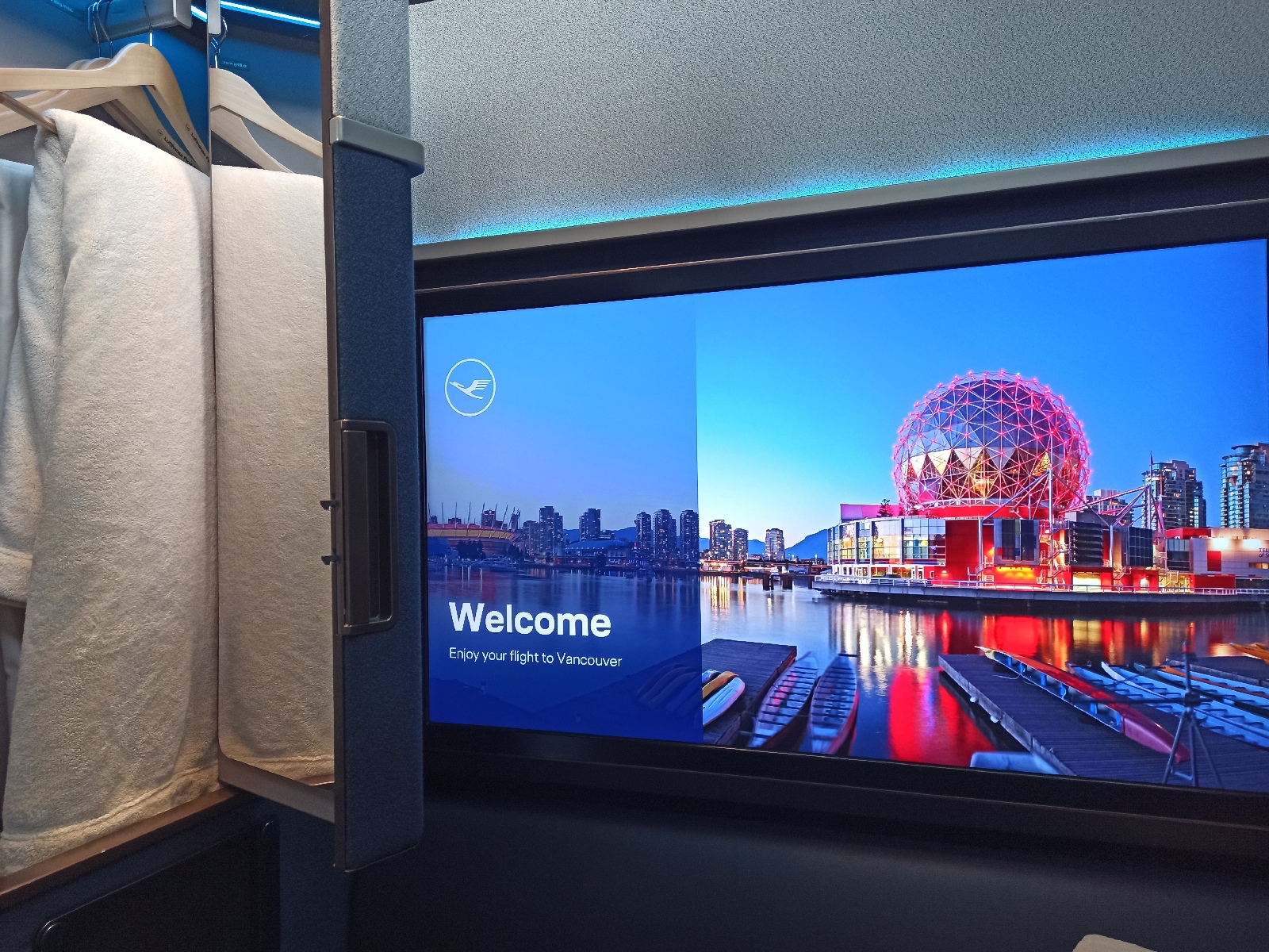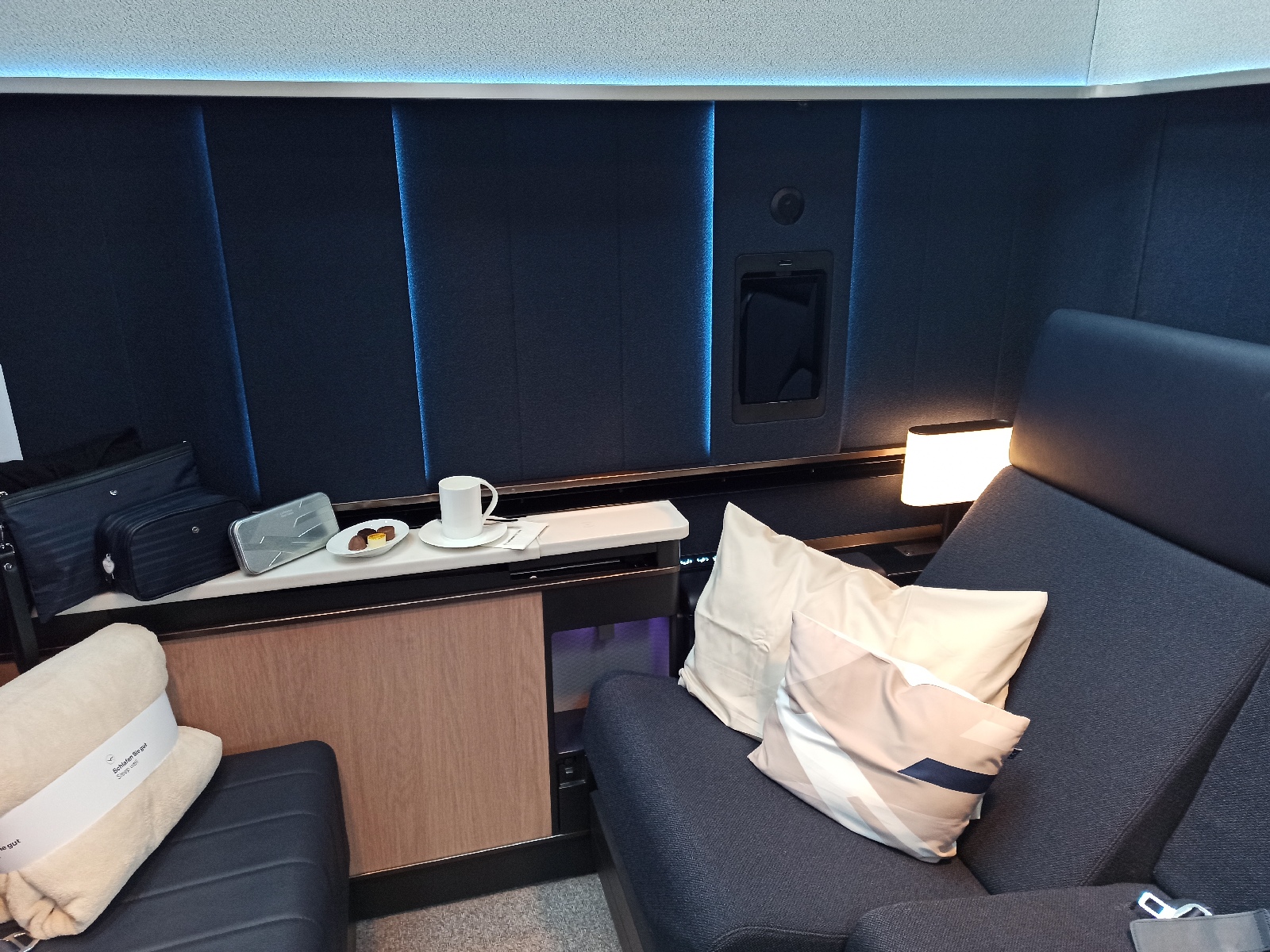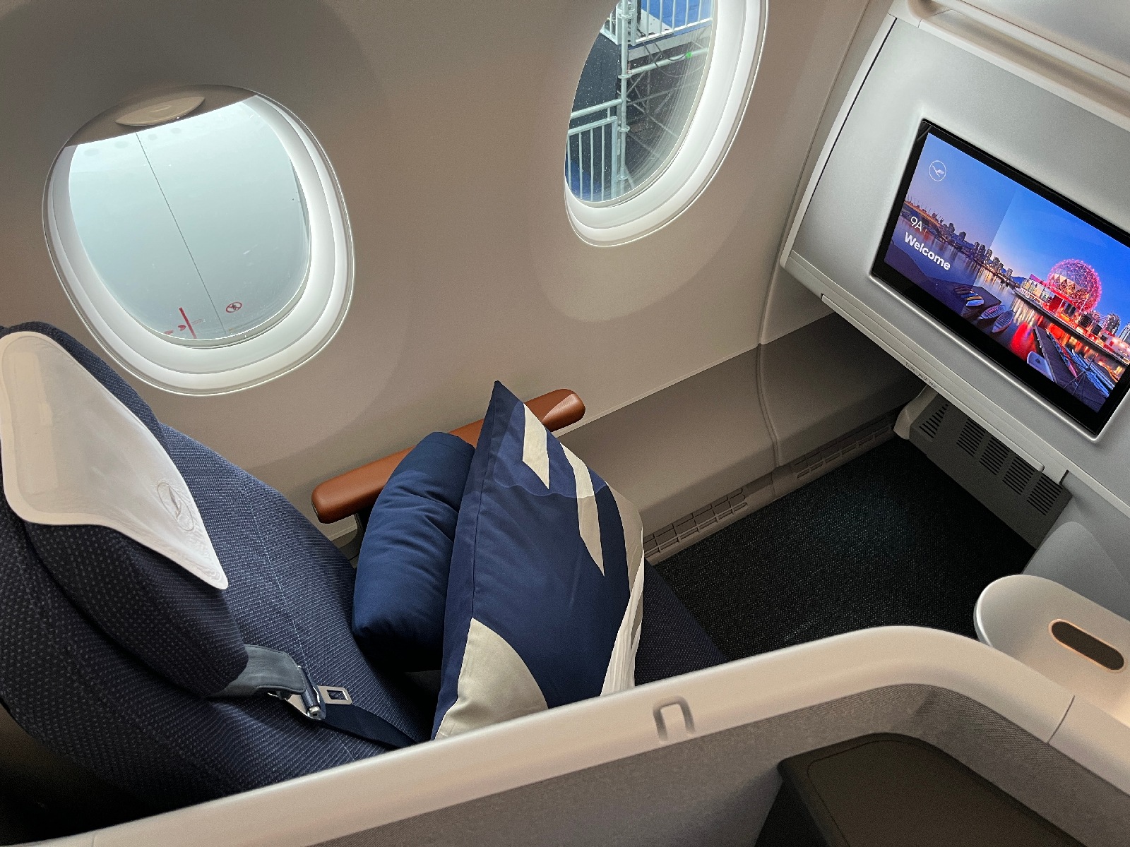 Die Business Class Suite in der ersten Reihe der Kabine beindruckt durch die hohen Wände, sowie den großen persönlichen Freiraum. Es wird sicherlich das Vorzeigeprodukt der Lufthansa in der Business Class. Die zu sehende Trennwand lässt sich komplett runterfahren, sofern man dies möchte.