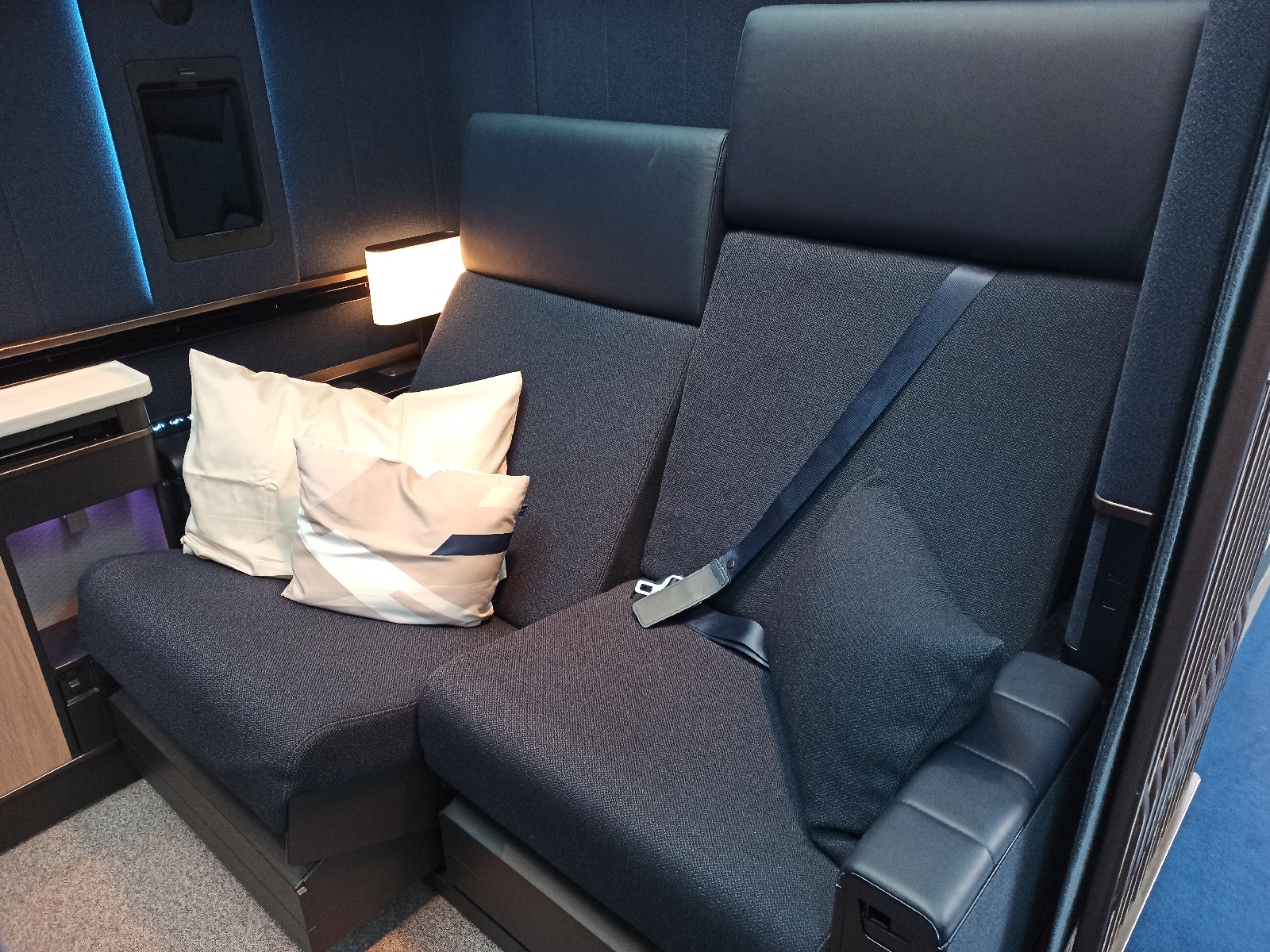 Hier ein genauer Blick auf den Einzelsitz direkt am Fester mit mehr Abstand zum Gang für mehr Privatsphäre. Darum wird dieser als “Business Class Privacy Seat” vermarktet. Dieser Sitz kommt auch mit einem sehr großen Tisch.