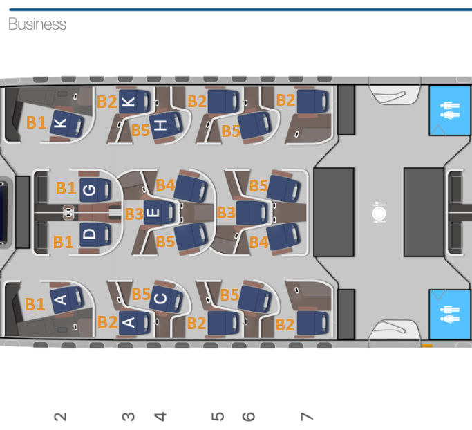 - Business Class Classic Seat (B5): Der Business Class Classic Seat kommt, neben den oben erwähnten Eigenschaften, über die alle Sitze der Business Class verfügen, ohne besondere Merkmale aus. Die Business Class Classic Einzelsitze im äußeren Bereich der Kabine liegen eher am Gang und nicht am Fenster. Zwischen dem Classic Seat und dem Business Class Extra Long Bed Seat in der letzten Reihe befindet sich eine verstellbare Trennwand. Aufpreis für die gezielte Reservierung: kostenfrei