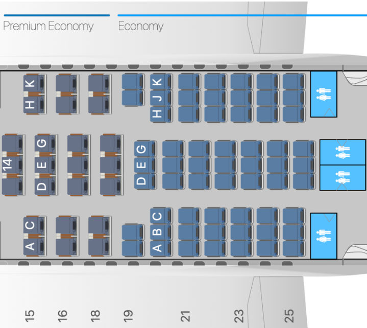 Die Economy Class Preferred Zone Seats befinden sich in den Reihen 22 bis 25. Die Economy Class Legroom Seats fiondet man in Reihe 20 und 21 und die Extra Legroom Seats sind 26A, 26B, 26C, 26H, 26J und 26K.