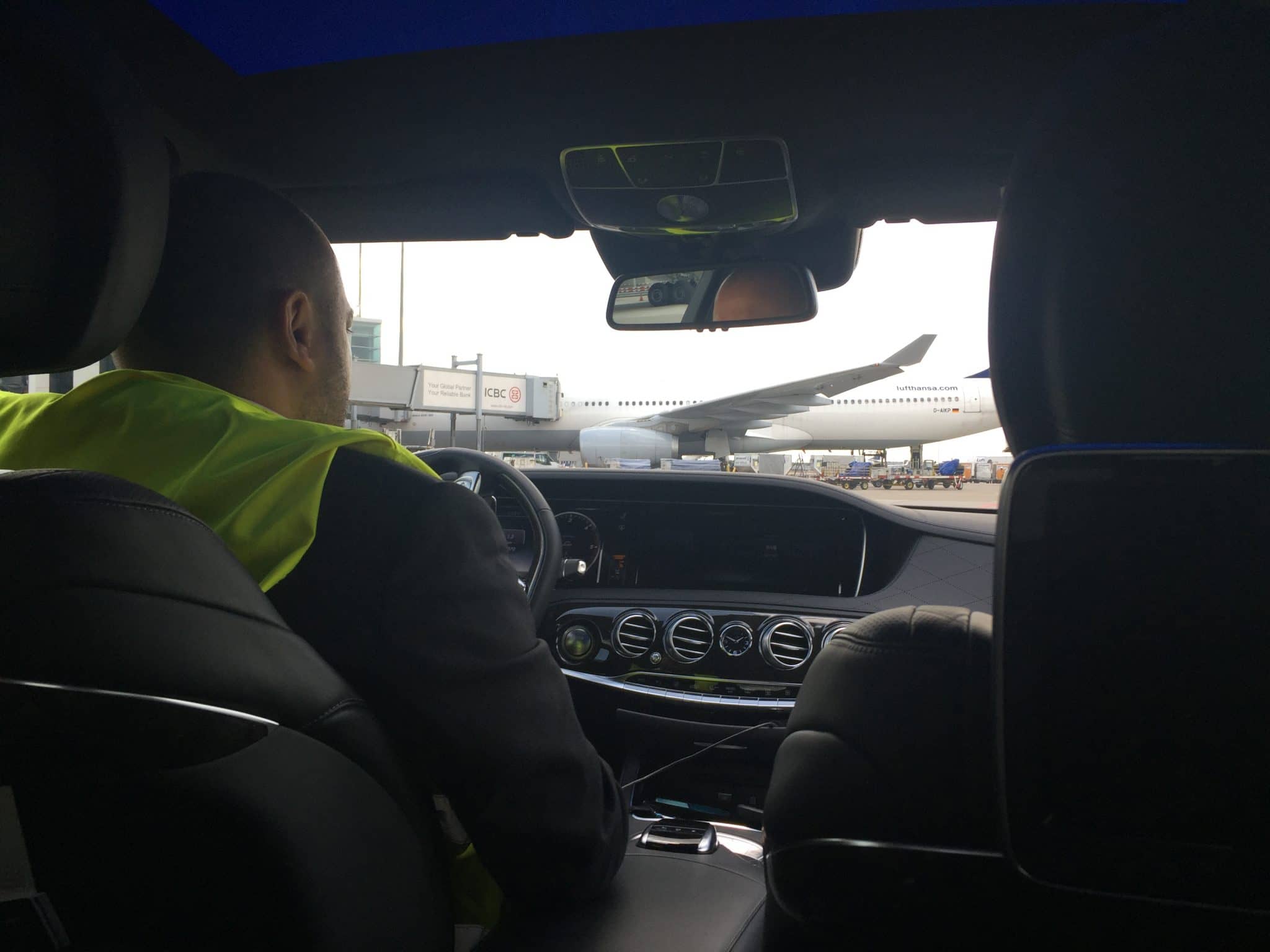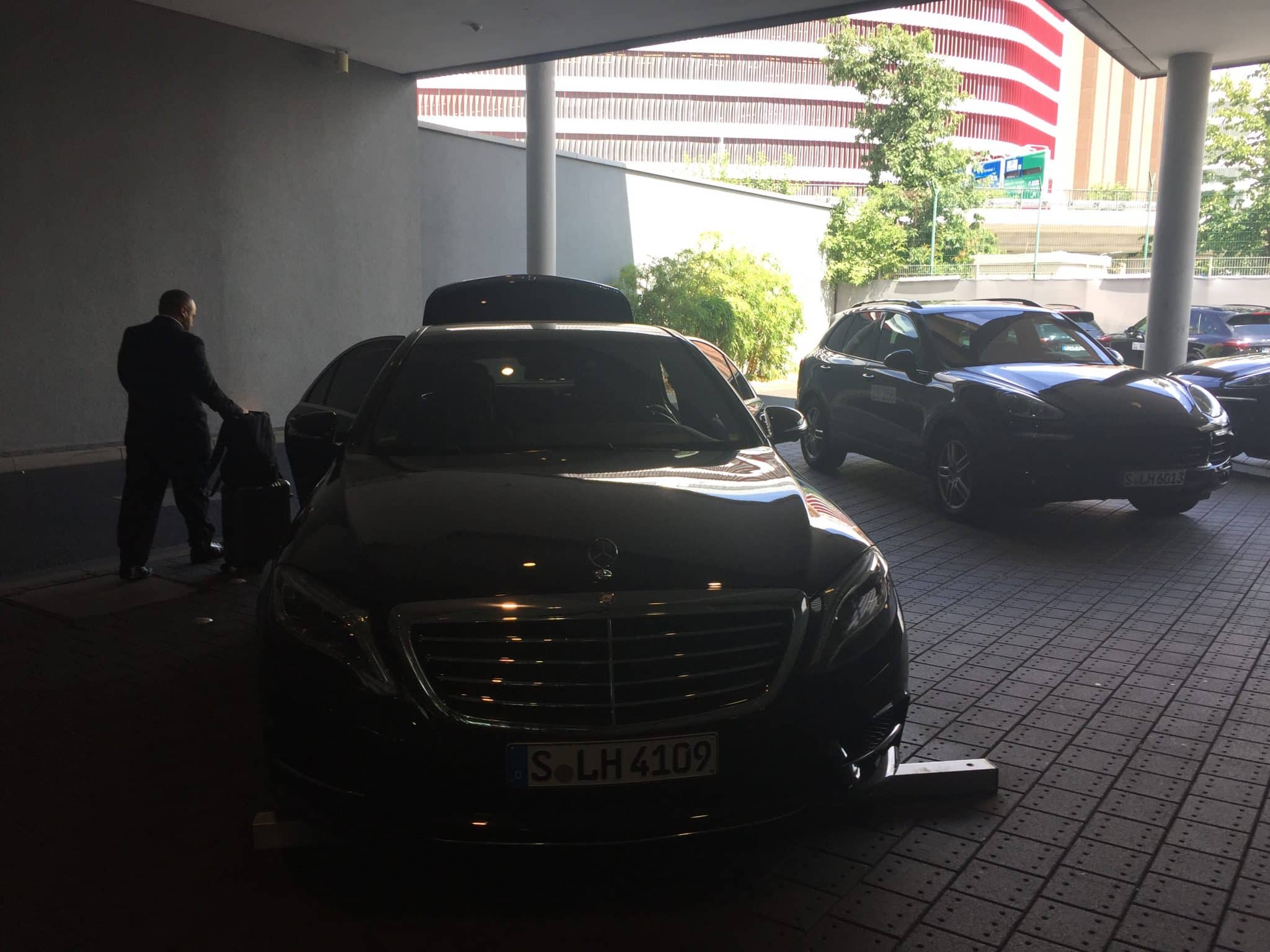 Vor der Tür befand sich ein kleiner Fuhrpark, bestehend aus Mercedes S-Klasse und Porsche Cayenne. Der Fahrer lud kurz das Gepäck ein und schon konnte es losgehen. Bei meinen beiden Flügen wurde ich in einem Fall mit zwei weiteren Passagieren in einem Minivan befördert und das andere Mal in einer S-Klasse – auch hier war noch ein weiterer Passagier dabei.