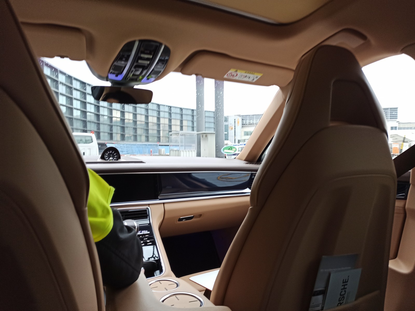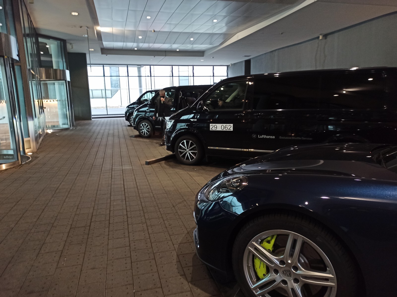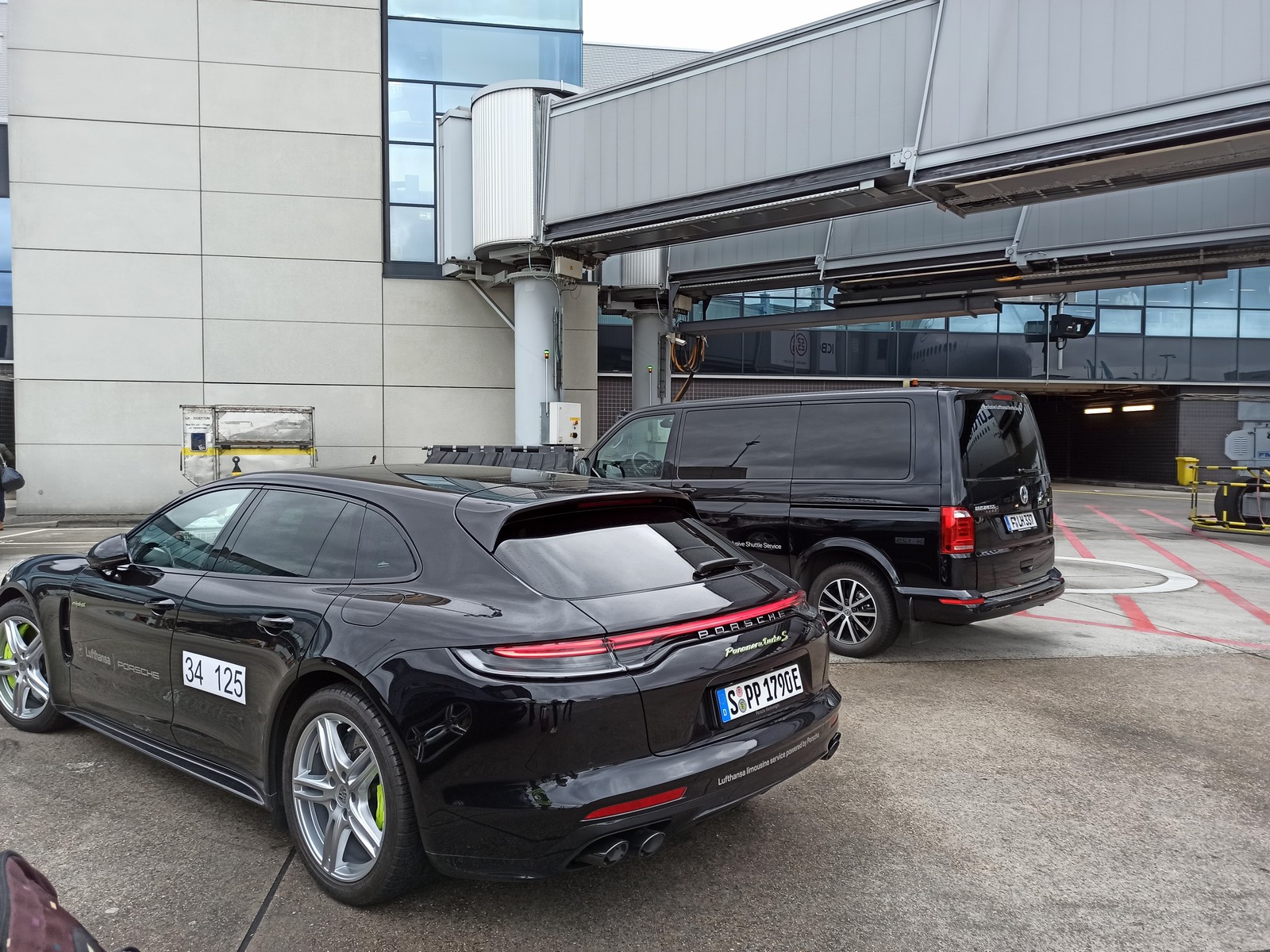 Zusammen mit der aufmerksamen Lufthansa Mitarbeiterin, die für uns zuständig war, fuhren wir als letzte Gruppe mit dem Fahrstuhl in das untere Stockwerk des First Class Terminals. Dort befindet sich eine kleine Passkontrolle sowie ein kleines Gate, an dem die Bordkarten gescannt werden. Hinter diesem Gate stehen die Fahrzeuge schon bereit. Die Fahrerinnen und Fahrer warteten bereits auf uns und nach der Passkontrolle und dem Scan der Bordkarte wurden wir zum Auto geleitet, was in unserem Fall einer der beiden Porsche Panamera war. Während ich einen Blick auf die bereitstehenden Fahrzeuge warf, kümmerte sich unsere Fahrerin um das Gepäck und öffnete für Lisa bereits die Tür.