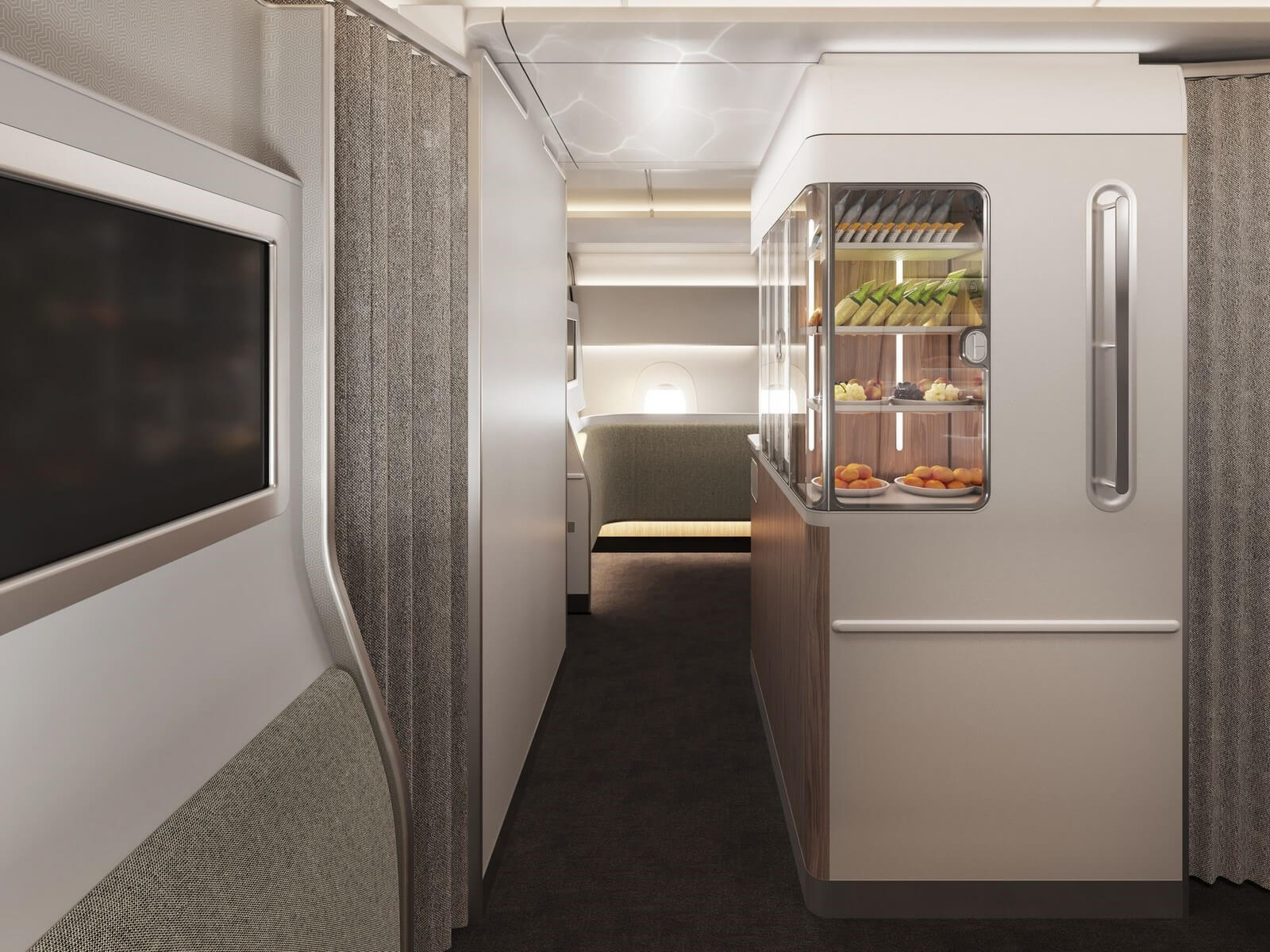 Die sechs First Class Suiten lässt Qantas für das Project Sunrise in einer 1-1-1 Konfiguration einbauen. Die Wände der Suiten haben eine Höhe von 1,4 Metern. Im Vergleich zur vorhandenen First Class im Airbus A380 verfügt die neue Suite über 50 Prozent mehr Platz.
