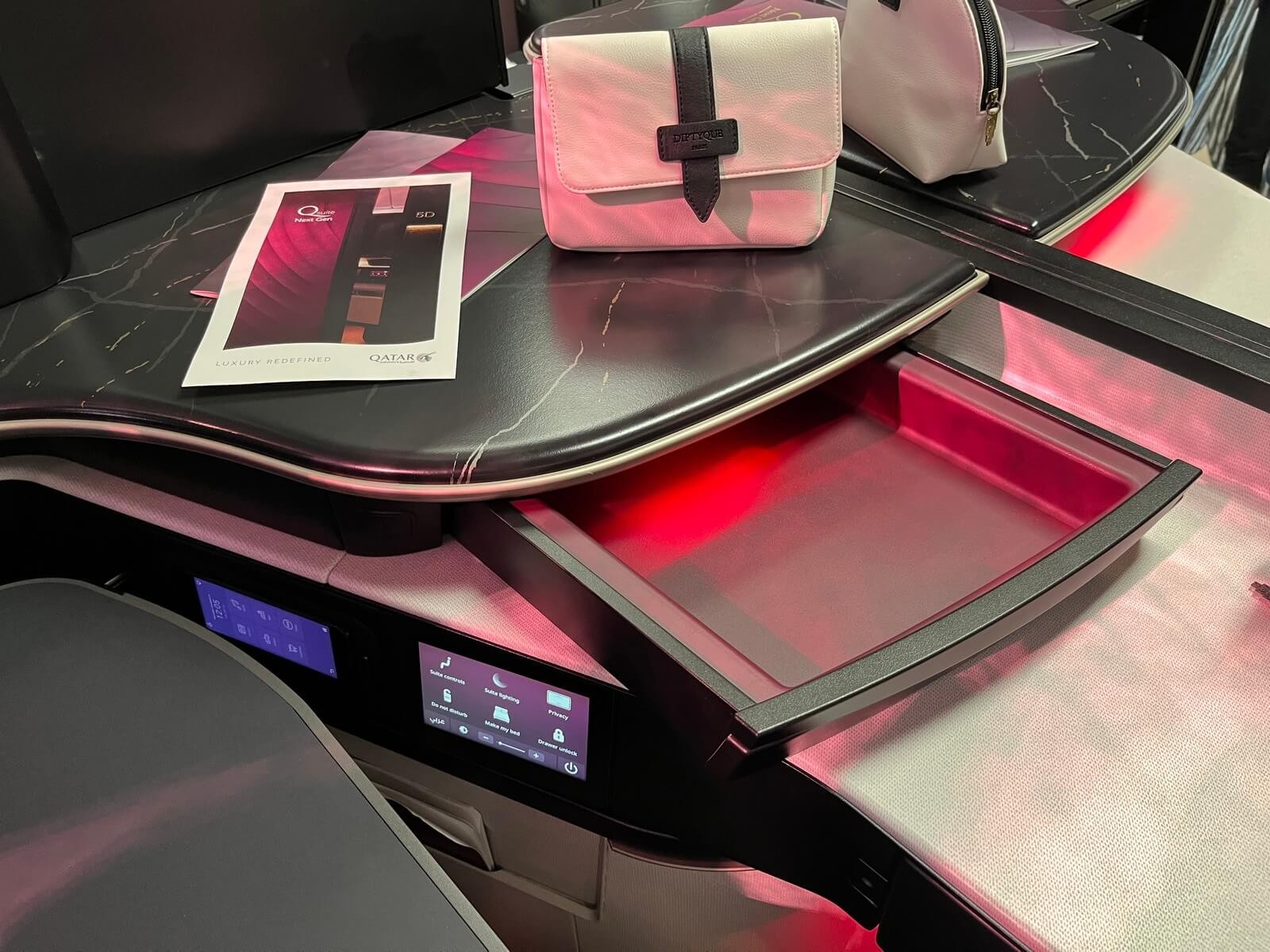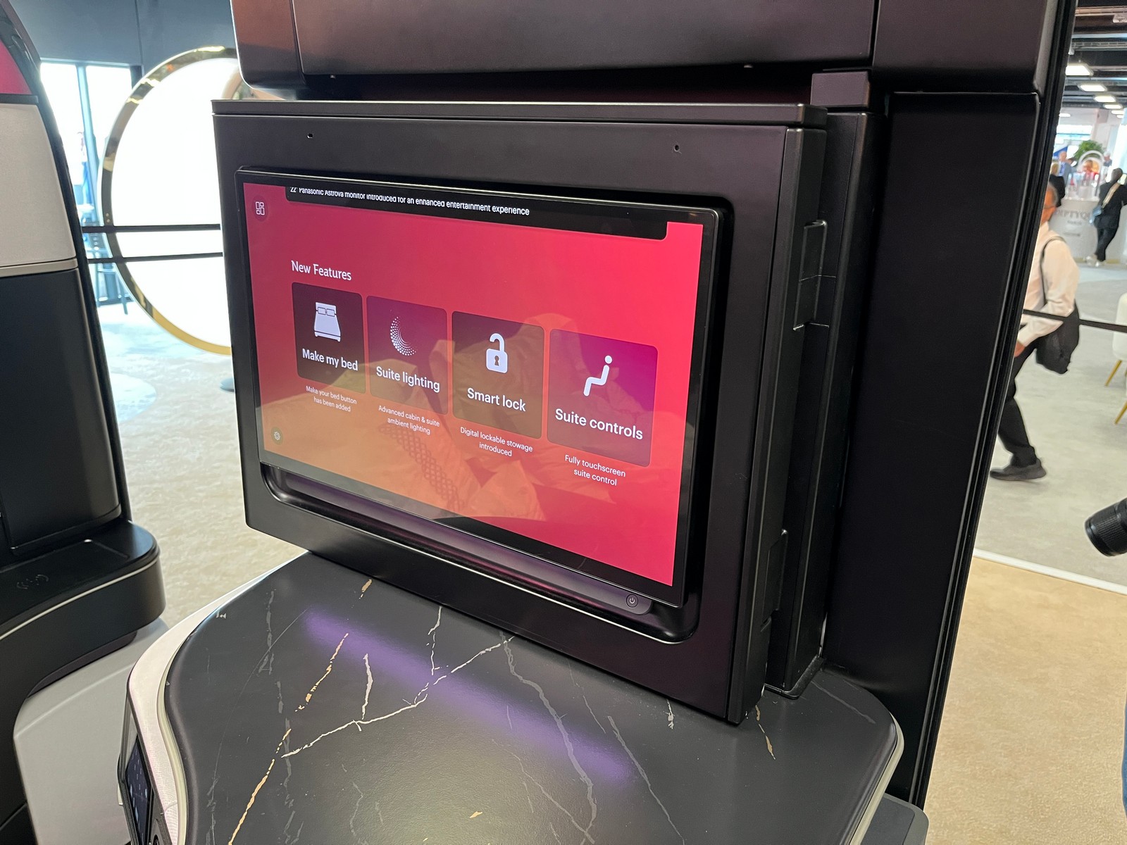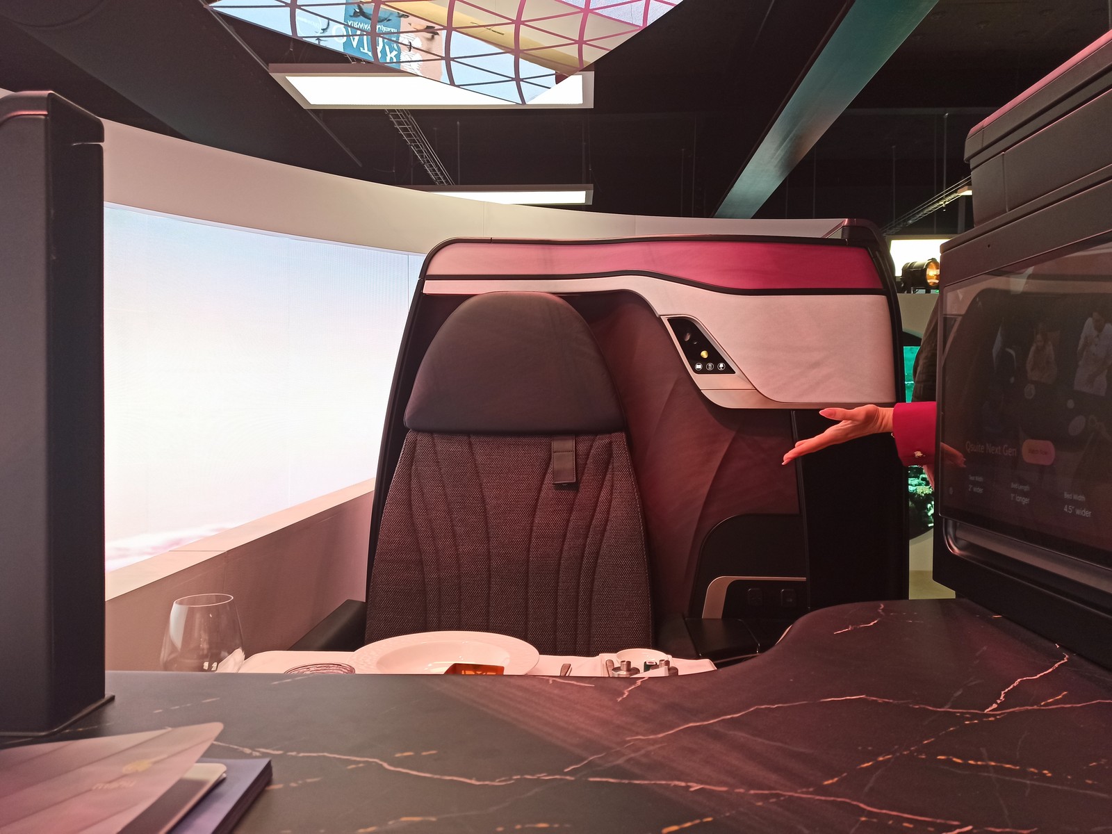 In den Quad-Suiten in der Mittelreihe, in denen bis zu vier Plätze miteinander verbunden werden können, ist die Mittelwand aus Bildschirmen nun ganz einklappbar. Bisher konnte man die Trennwand in der Mitte des Quads nur in der Mitte öffnen. Was bei uns bei unserem Besuch am Stand von Qatar Airways direkt auffiel, waren die höheren Wände der Suite und der breitere Sitz.