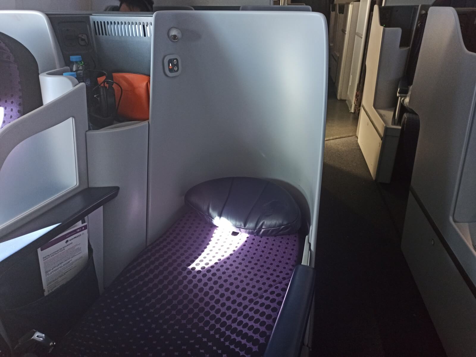 Die Sitze lassen sich zu einem fast flachen Bett ausfahren. Durch die Sitzschale hat man zumindest am Kopf minimale Privatsphäre. Für Reisende mit einem breiten Kreuz könnte es schwierig werden, auf dem Rücken bzw. auf dem Bauch zu liegen. Die Liegefläche an den Gangsitzen kann etwas ausgeweitet werden, indem man die Armlehne herunterdrückt. Seitenschläfer stoßen wiederum im Fußbereich an ihre Grenzen. Nach ein paar Stunden Schlaf fällt mein Urteil über diesen Sitz als Bett gemischt aus. Die Liegefläche des Sitzes ist bequem und nirgends drückt oder zwickt es. Allerdings ist mir die Sitzbreite zu gering, man stößt sich beim Drehen unweigerlich irgendwo an und ich fühlte mich etwas eingeengt.