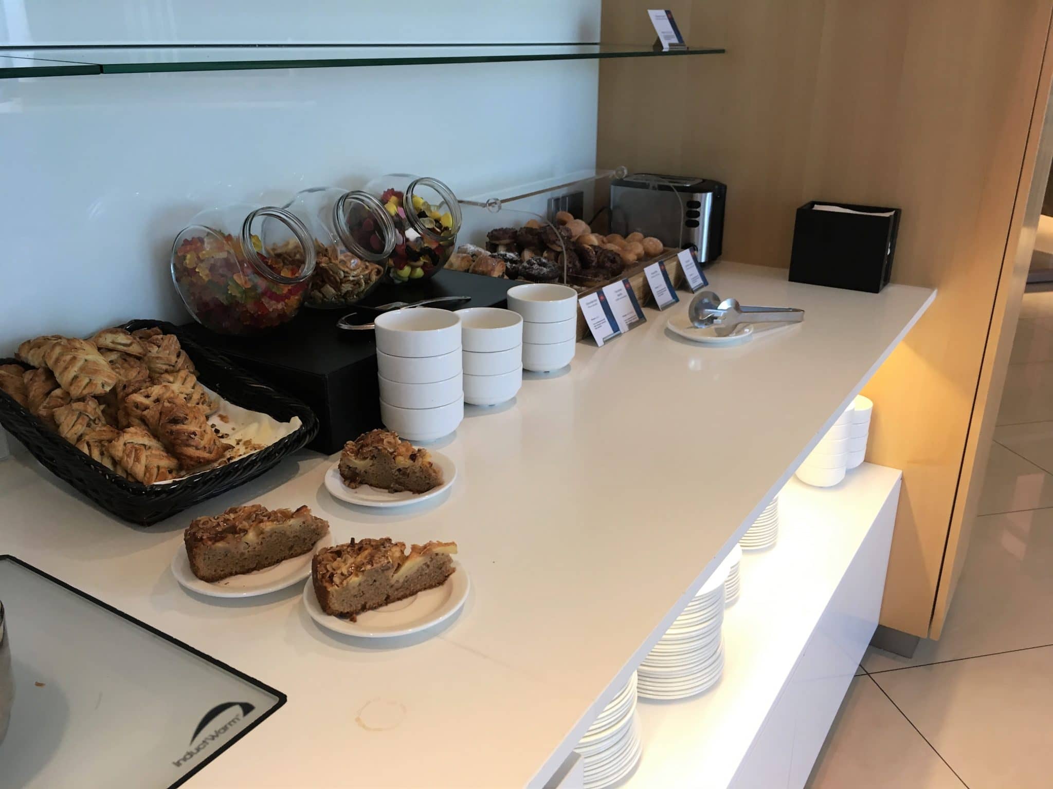 Die Auswahl an Speisen und Getränken empfand ich als sehr gut für eine Business Class Lounge. Es gab warme Speisen, unter anderem Hühnchen in Barbecue Sauce mit Kartoffeln und Kräutern, eine Gemüsesuppe und Nudeln mit Hühnchen. Dazu gab es zahlreiche kalte Speisen, Salate, Brezel oder belegte Brötchen. Für die Schleckermäuler gab es Kuchen, Donuts, Muffins, Schokocroissants oder Chips. Es sollte eigentlich für jeden etwas dabei sein um den Hunger zu stillen. Neben Softgetränken, Säften, Bier und den unterschiedlichsten Sorten Kaffee, gab es auch einen günstigen Champagner und eine gute Auswahl an hochprozentigem Alkohol. Im Vergleich zu den SAS Gold Lounges (Review: SAS Gold Lounge Stockholm-Arlanda; Review: SAS Gold Lounge Kopenhagen-Kastrup; Review: SAS Gold Lounge Oslo-Gardermoen), die ich eine Zeit lang regelmäßig besucht habe, war das ein großer Klassenunterschied was die Auswahl an Speisen und Getränken betrifft. Hier ein paar Impression von Speisen und Getränken: