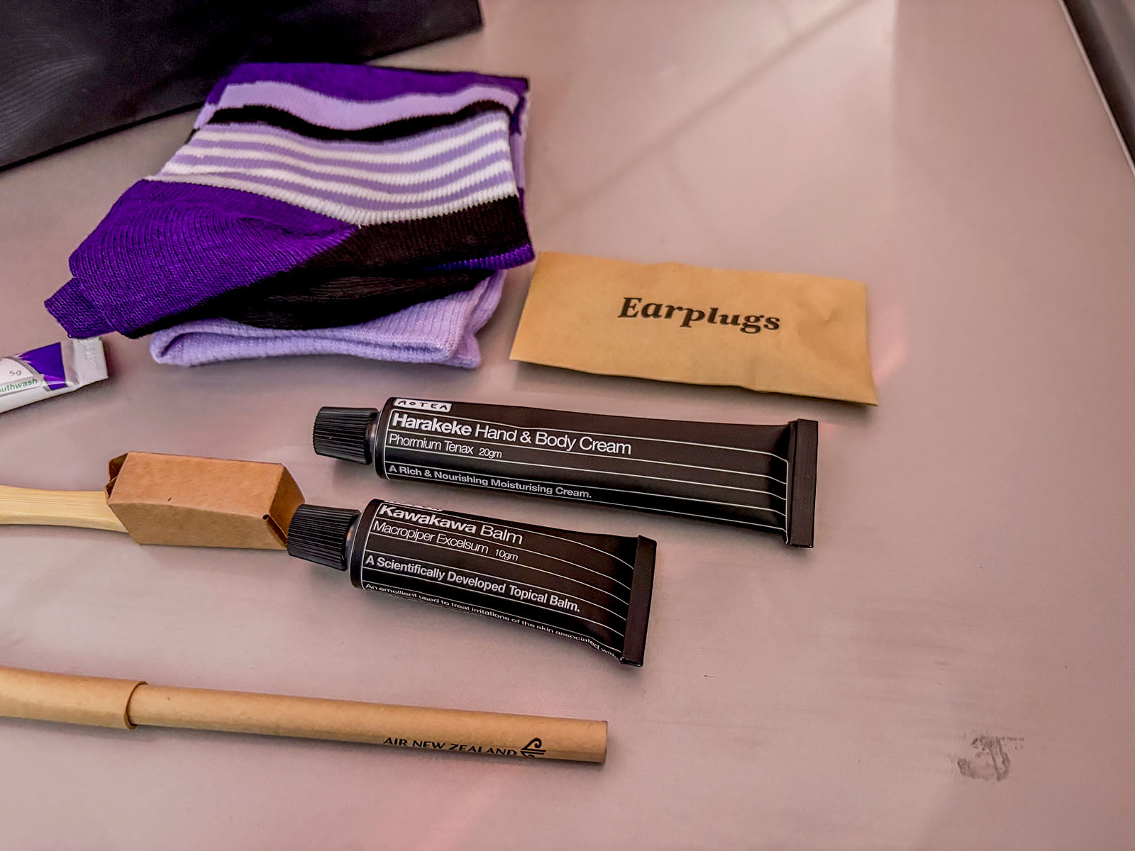 Seit einigen Jahren nutzt die Airline eine Tasche aus recyceltem Papier mit Überschlag und Magnetverschluss als Amenity Kit – optisch wie eine kleine Lunchbag gestaltet. Dieses nachhaltige Design passt zur Umweltstrategie der Airline und setzt ein klares Statement (der Beutel ist recycelbar). Enthalten waren hochwertige Kompressionssocken im lila Streifendesign, weiche Ohrstöpsel, eine Bambus-Zahnbürste mit Mini-Zahnpasta sowie – statt Schlafmaske – ein Kugelschreiber aus recyceltem Papier. Das Highlight sind die Pflegeprodukte der neuseeländischen Marke Aotea Health – eine 20 Gramm Harakeke Hand & Body Cream und ein 10 Gramm Kawakawa Balm. Beides exzellent und absolut empfehlenswert.