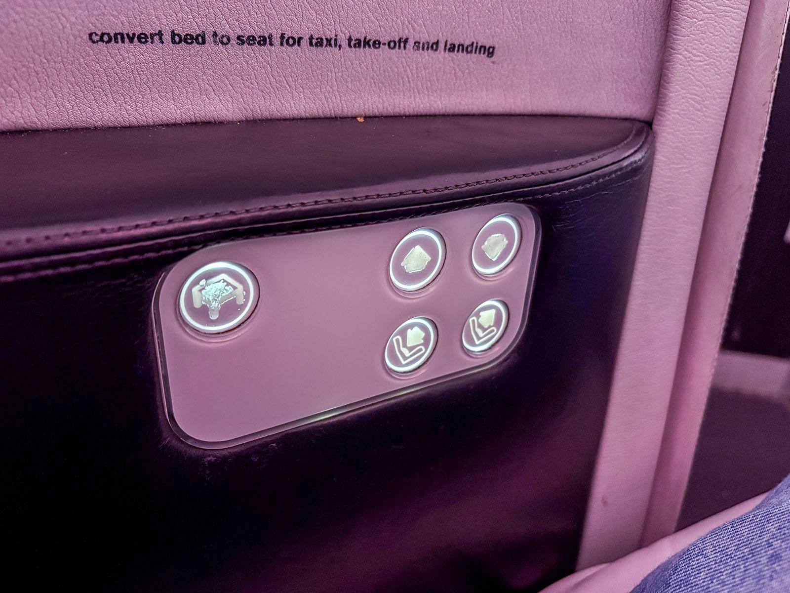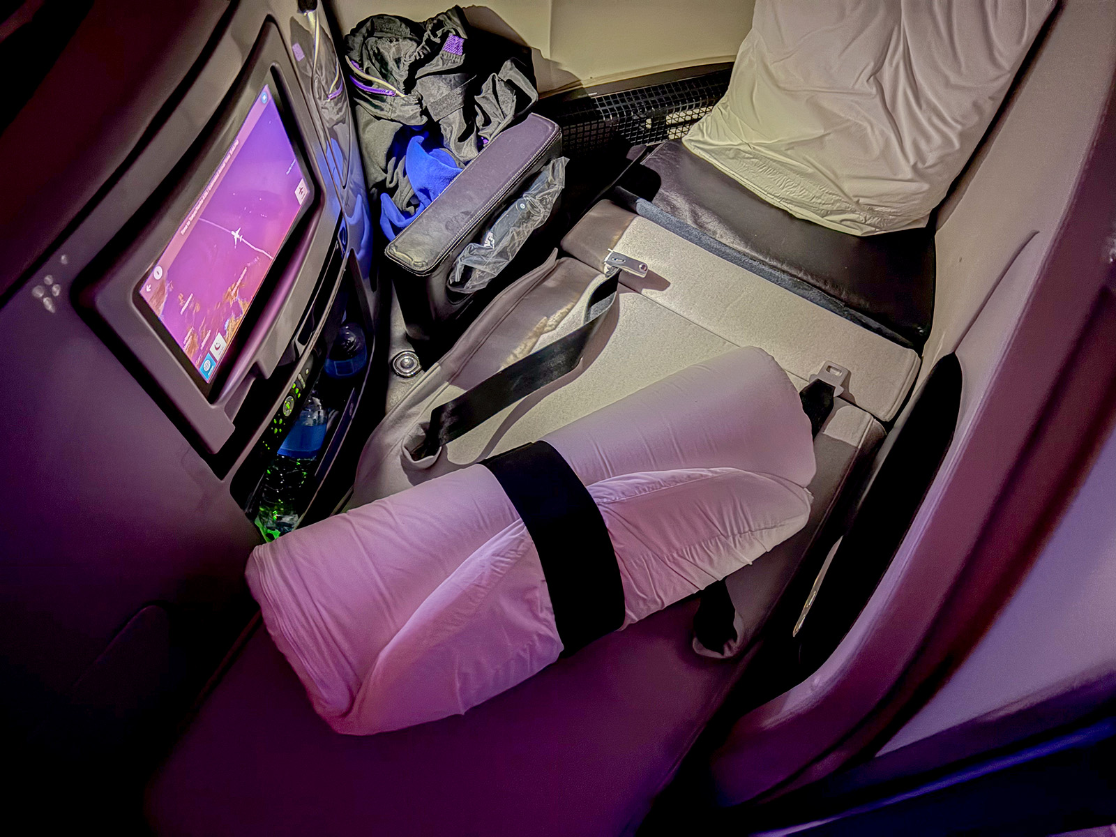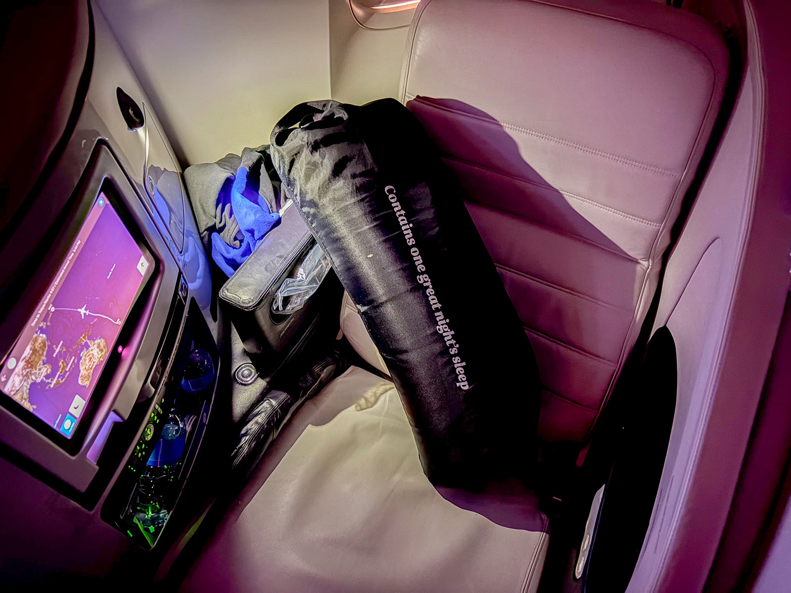 Anders als in so manch anderen Business Class Produkten lässt sich der Sitz nicht stufenlos in eine Liegeposition verstellen. Stattdessen erfolgt der Umbau per Knopfdruck oberhalb des Ottomans vollständig automatisch. Die Rückenlehne klappt nach vorne und der Sitz sackt in sich zusammen, wodurch eine rund zwei Meter lange und flache Liegefläche entsteht. Üblicherweise bietet die Crew proaktiv an, den Sitz für euch umzubauen und ihn mit einem weichen Memory Foam Topper, einer gemütlichen Decke sowie einem hochwertigen Kopfkissen vorzubereiten.