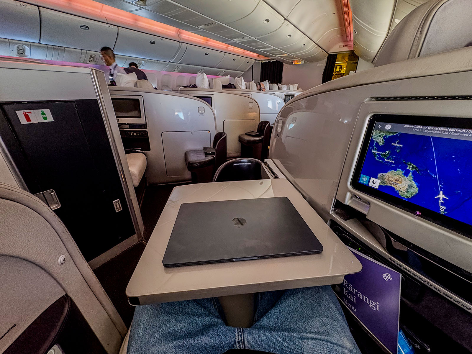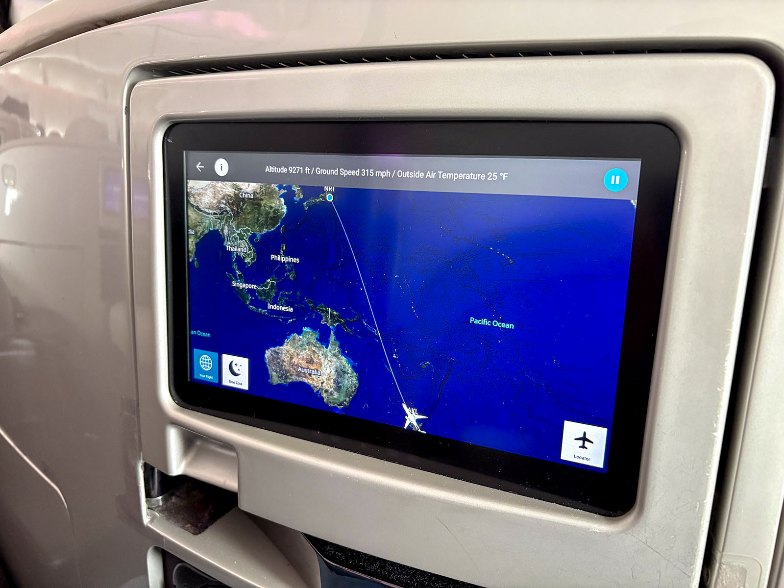 Man nimmt zwangsläufig immer etwas von der Bewegung in der Kabine wahr, sodass sich der Sitz auf jeden Fall nicht so abgeschirmt anfühlt wie beispielsweise der Lufthansa Allegris Privacy Seat. Trotzdem habe ich mich auf diesem Flug sehr wohlgefühlt. Es war ein sonniger und ruhiger Flug, der uns vorbei an Neukaledonien, Vanuatu, Solomon Islands und Guam führte.
