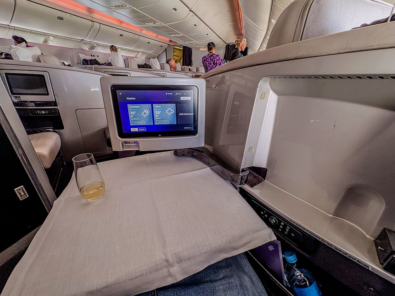 In der Boeing 777-300ER von Air New Zealand wähle ich meist entweder die letzte Reihe der vorderen oder die erste Reihe der hinteren Business Class Kabine – beide Optionen kann ich absolut empfehlen. Auf diesem Flug hatte ich in Reihe 7, ganz hinten in der vorderen Kabine, das Glück, dass niemand neben oder vor mir saß. Meine Aussicht vom Sitz sah entsprechend entspannt aus: