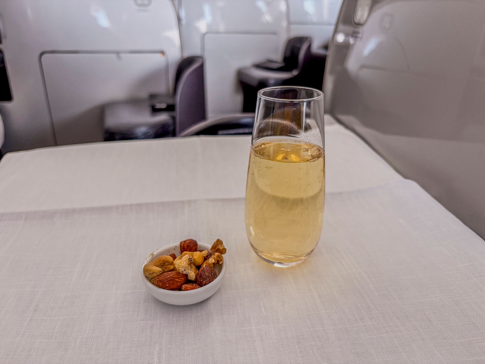 Ich war auf diesem Flug der letzte Passagier an Bord, sodass ich leider nicht berichten kann, wie das Boarding verlief. In Auckland verläuft das Boarding auf NZ Flügen meist sowieso recht zügig und geordnet. Die Business Class von Flug NZ99 war an diesem Tag zudem alles andere als ausgebucht. Geboardet wurde über eine einzige Fluggastbrücke zur Door 2L, sodass ich beim Betreten des Flugzeugs direkt nach links in die vordere Business Class Kabine abbiegen konnte. Begrüßt wurde ich mit einem freundlichen Kia Ora der Crew. Kaum hatte ich auf meinem Platz 7K genommen, wurde auch schon das obligatorische Begrüßungsgetränk angeboten. Zur Auswahl standen Champagner, Orangensaft oder Wasser.