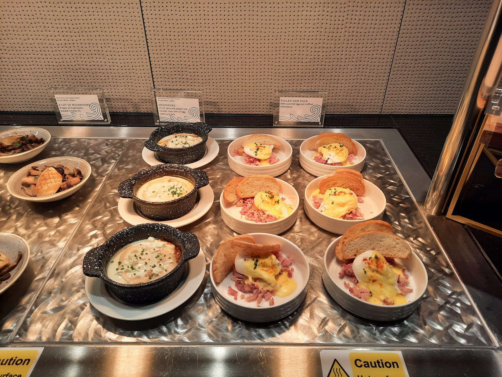 Das Buffet befindet sich auf die Bar blickend rechts. Während unseres Besuches am Morgen gab es unter Anderem eine Auswahl an kontinentalem Frühstück, darunter:
