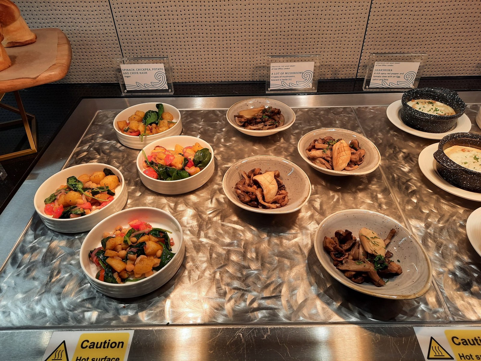 - Grilled Zucchini, Sauteed Mushrooms, Potato Rosti, Cumberland Sausage, Omelette wiht spinach, cheese & scallion, Shakshuka