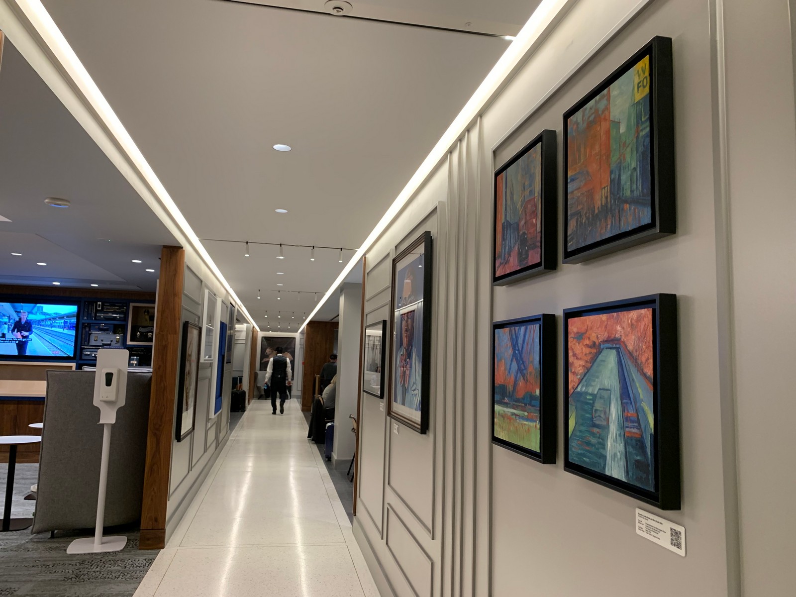 Nach dem Check-In biegt man kurz um die Ecke und blickt einen langen Gang hinunter, der sich fast durch die gesamte Lounge zieht. Der Flur erfüllt dabei gleichzeitig die Funktion einer kleinen Kunstgalerie. Über einen QR Code unter den Bildern lässt sich mehr zu den Kunstwerken erfahren.