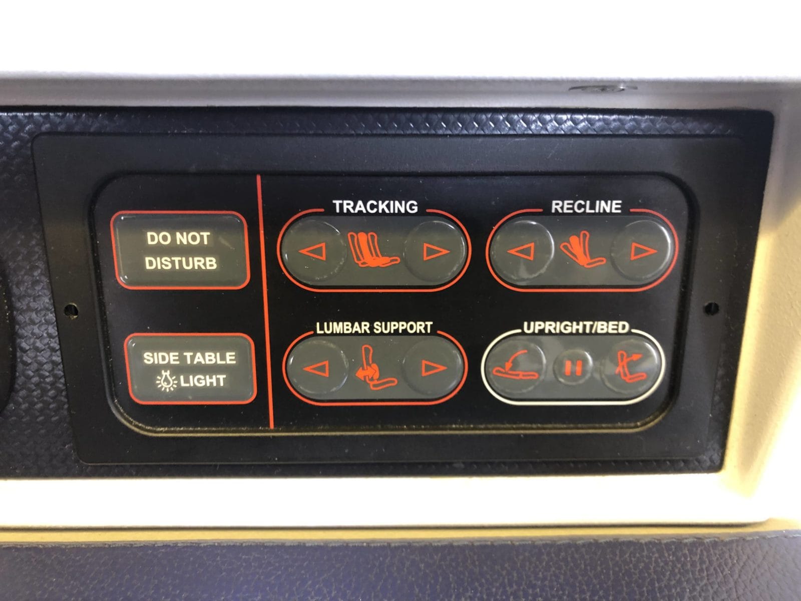 Über der Armlehne auf der Ablageseite befindet sich der Controller für den Monitor und die Knöpfe zur Einstellung der Sitzposition. Zwei weitere Knöpfe für den Sitz befinden sich etwas weiter hinten und höher an der Außenverkleidung des Sitzes. So kommt man auch in der Schlafposition optimal an die Sitzeinstellungen. Bei einer Liegefläche von 190 cm und einer Breite von 53 cm hat man hier eine optimale Liegefläche um ein paar Stunden zu schlafen. Da es sich um einen (gefühlten) Tagflug handelte, machte ich davon jedoch keinen Gebrauch.
