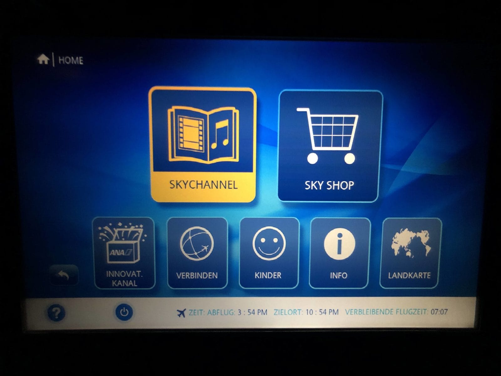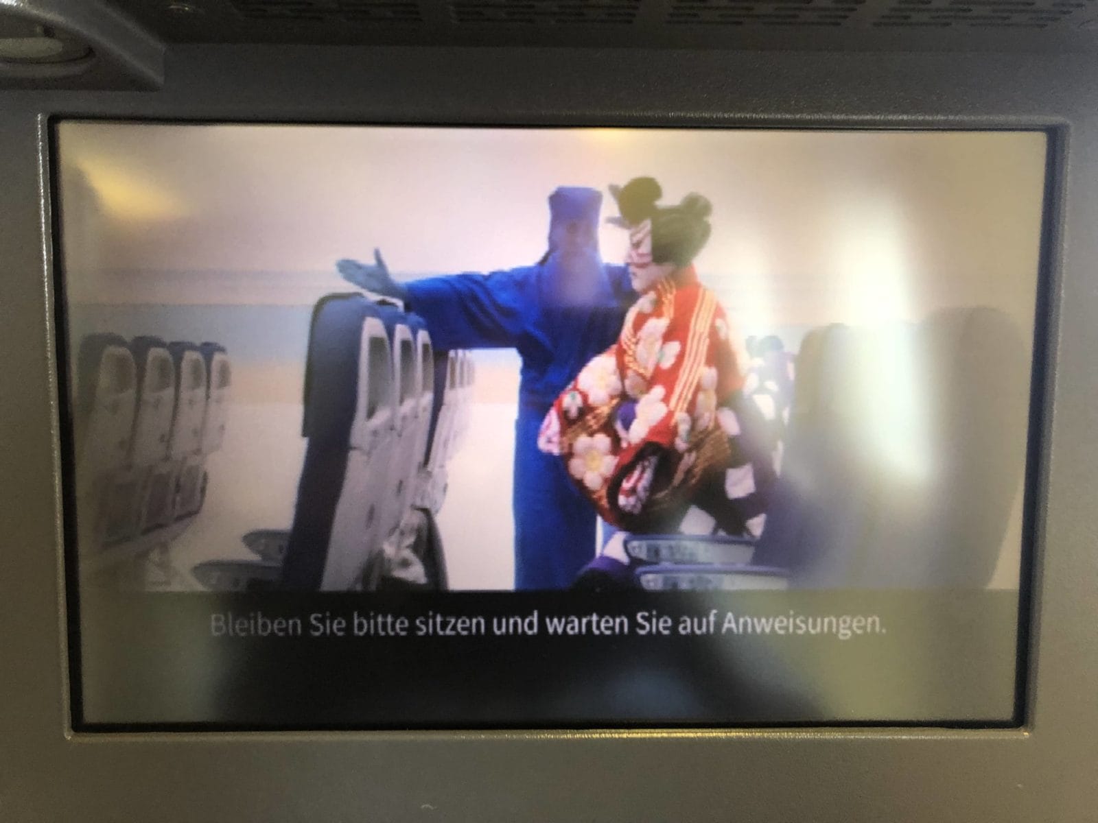 Auf dem Weg zur Startbahn wurde das Safety Video gezeigt. Bei ANA hat man ein wenig japanische Kultur mit eingebaut. So tragen die Personen in dem Video traditionelle Kimono Outfits. Sowas bietet dann ein wenig Abwechslung zu den ganz normalen Safety Videos, wie man sie von den meisten Airlines kennt. Ansonsten finde ich das Entertainment Programm bei All Nippon Airways durchaus verbesserungswürdig. Zum einen ist da der etwas ältere Monitor. An den Bildern kann man auch gut erkennen, dass bei Helligkeit in der Kabine der 17 Zoll Monitor nicht wirklich punkten kann. Oft wirkt das Bild ziemlich matt. Zum zweiten finde ich die Menüführung unnötig kompliziert. Wenn man einen Film gucken möchte, bekommt man keine Liste aller Filme zum scrollen. Man kann lediglich jeden einzelnen Film durchklicken, ohne große Sprünge zu machen. Das kann bei ca. 60 Filmen doch recht lange dauern. Vielleicht lohnt sich vor dem Flug daher ein Blick auf die ANA Enterainment Website.