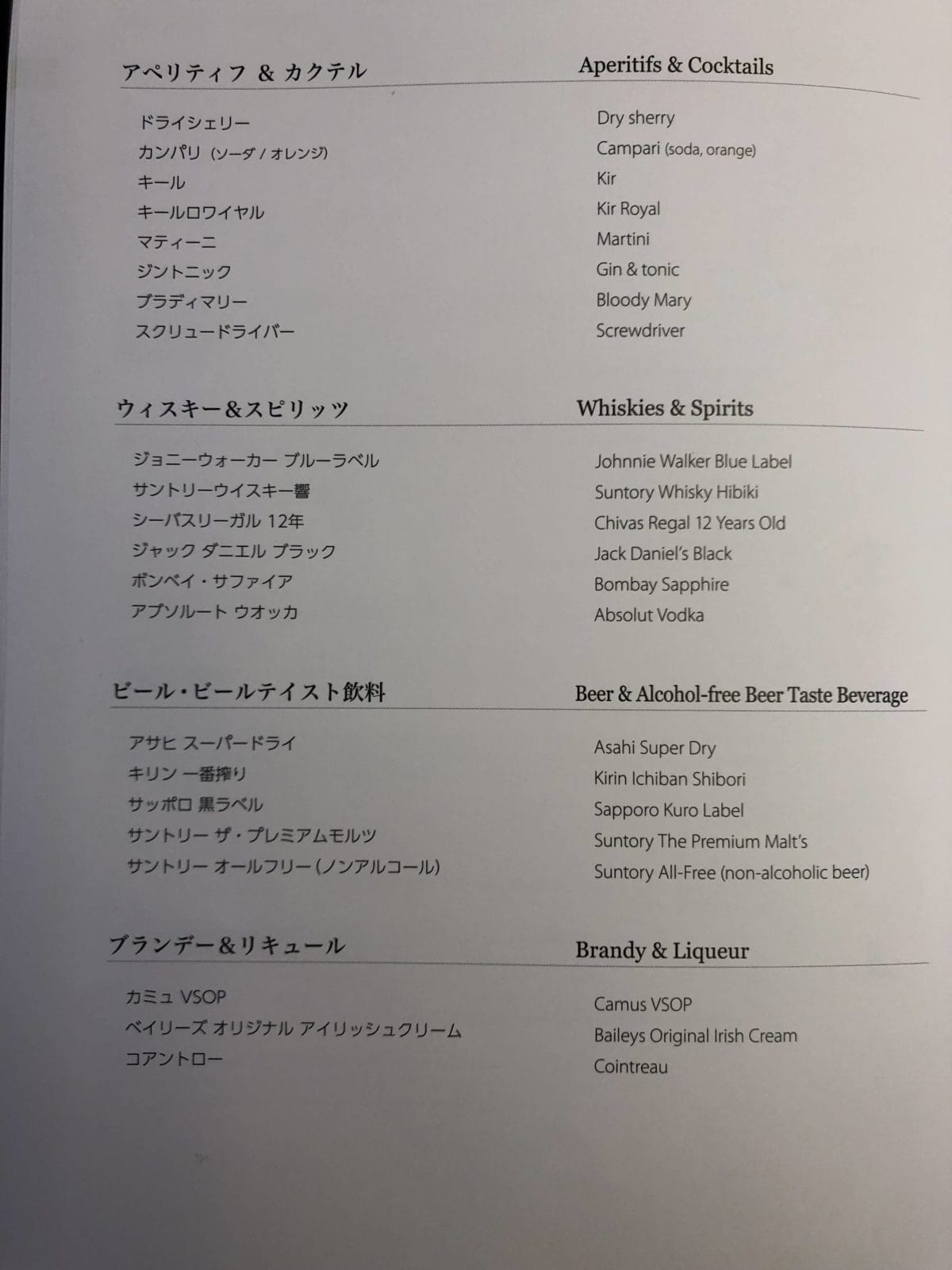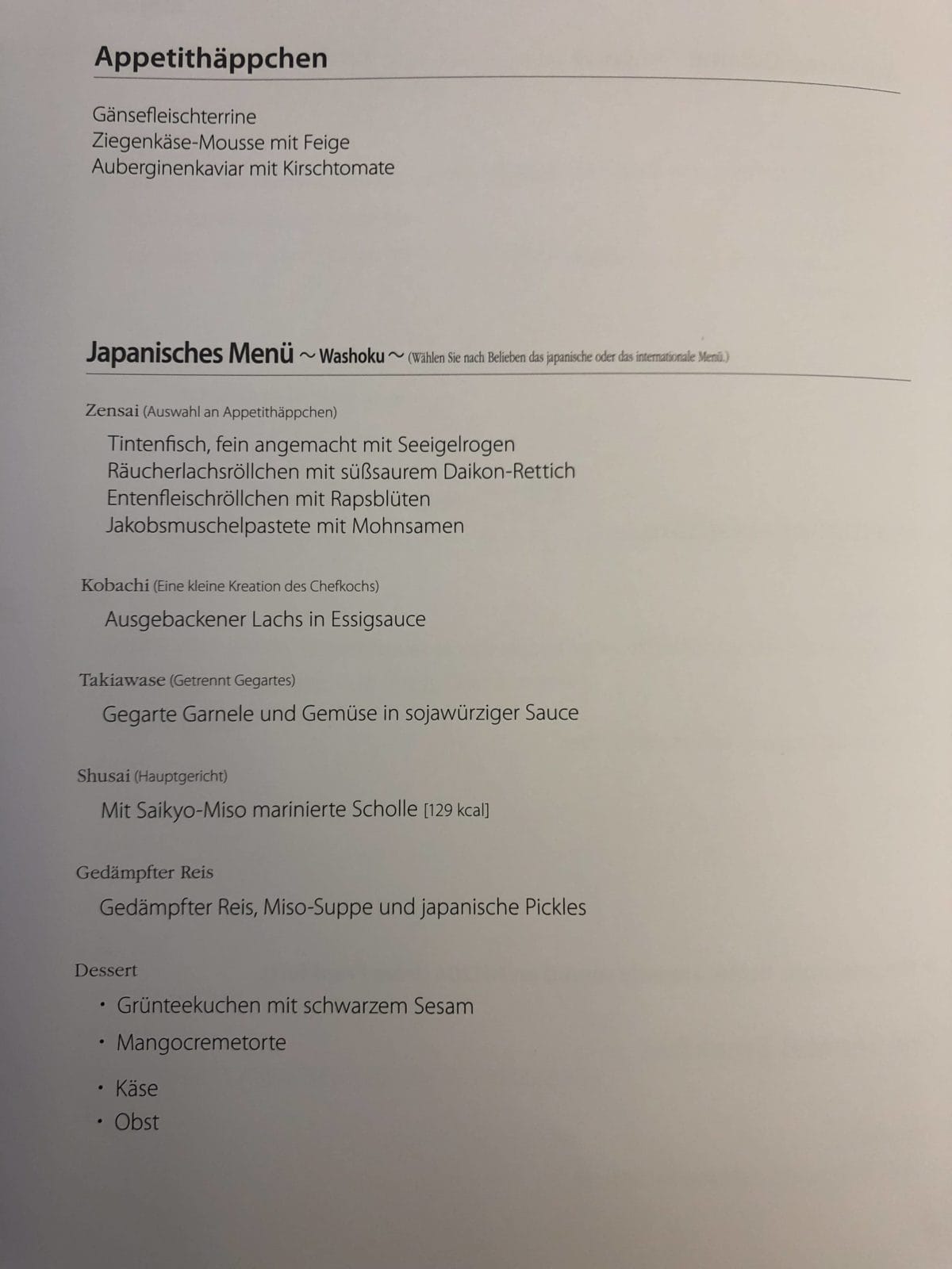Vor dem Start wurde mir noch die Menükarte ausgehändigt. Zur Wahl standen ein japanisches und ein westliches Menü. Ich entschied mich für das westliche Menü. Die Auswahl an Weinen konnte sich auf diesem Flug durchaus sehen lassen.