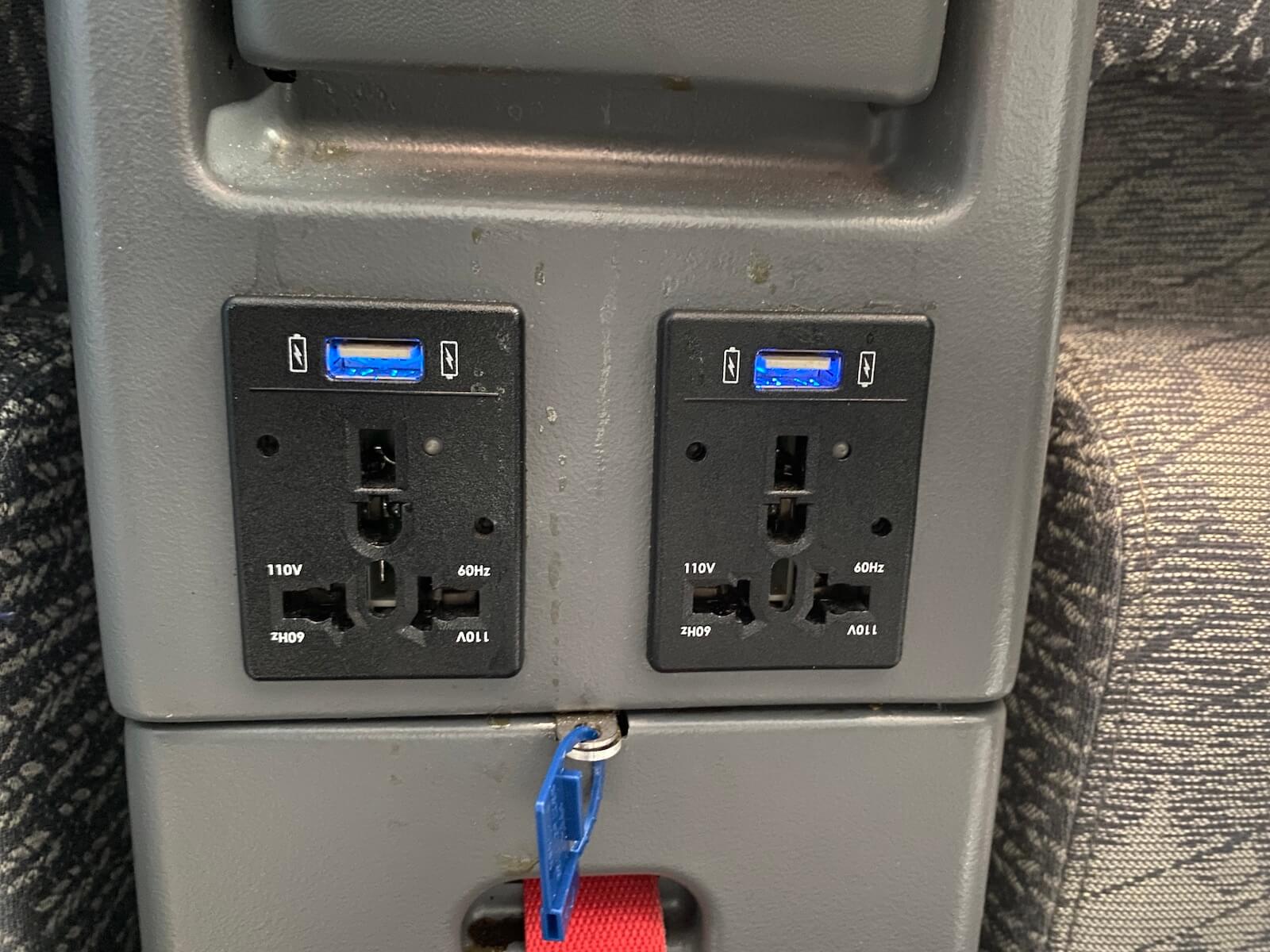 Der Sitz am Fenster hat auf der Fenster-Seite extra viel Stauraum und bietet Platz für eine größere Handtasche oder kleineren Rucksack. Vorne zwischen den Sitzen befinden sich zwei Getränkehalter. Unten am Sitz gibt es noch zwei Steckdosen und zwei USB-Anschlüsse, für jeden Sitz einen. Eine Leselampe befindet sich zwischen den Sitzen auf Kopfhöhe. Die Tische waren in der Mittelkonsole verstaut und es gab keine Probleme beim Rausholen oder Verstauen, alles funktionierte noch wie am ersten Tag. Ein Sichtschutz, falls ihr euren Sitznachbarn nicht kennen solltet, gibt es nicht.