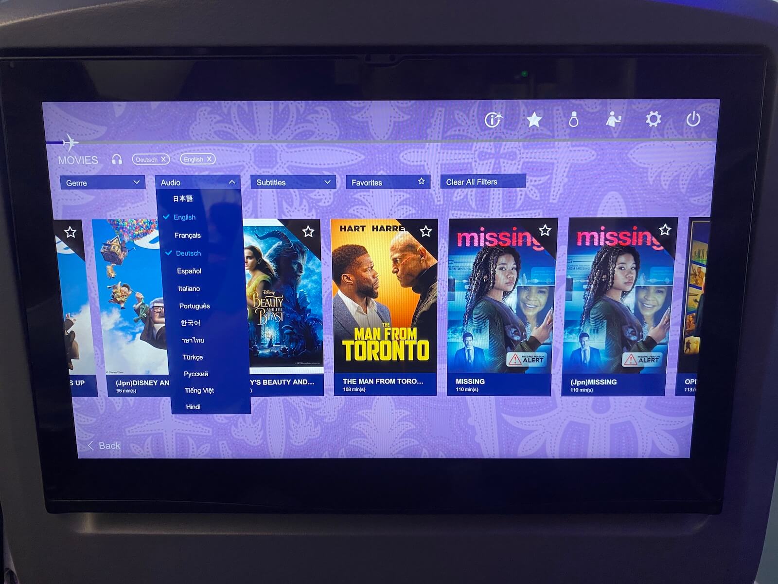 Die Auswahl an Filmen war in Ordnung und es gab auch einige Filme mit deutscher Tonspur, wonach sich auch selektieren ließ. Bei den Serien, das gleiche Problem wie bei vielen anderen Airlines, es gibt oftmals nur eine Folge. Das Routeninformationsprogramm war von Flightpath 3D und bot eine Bild-im-Bild-Funktion. Während ich mir die Route anschaute, konnte ich nebenbei auch mein Live TV im unteren rechten Eck des Monitors weiterschauen. Zusätzlich gab es noch drei Außenkameras an dem Airbus A380. Bei den Kopfhörern handelte sich um normale Overear-Kopfhörer, die keine Noise Cancelling Funktion hatten und so griff ich zu meinen eigenen Noise Cancelling Kopfhörer.