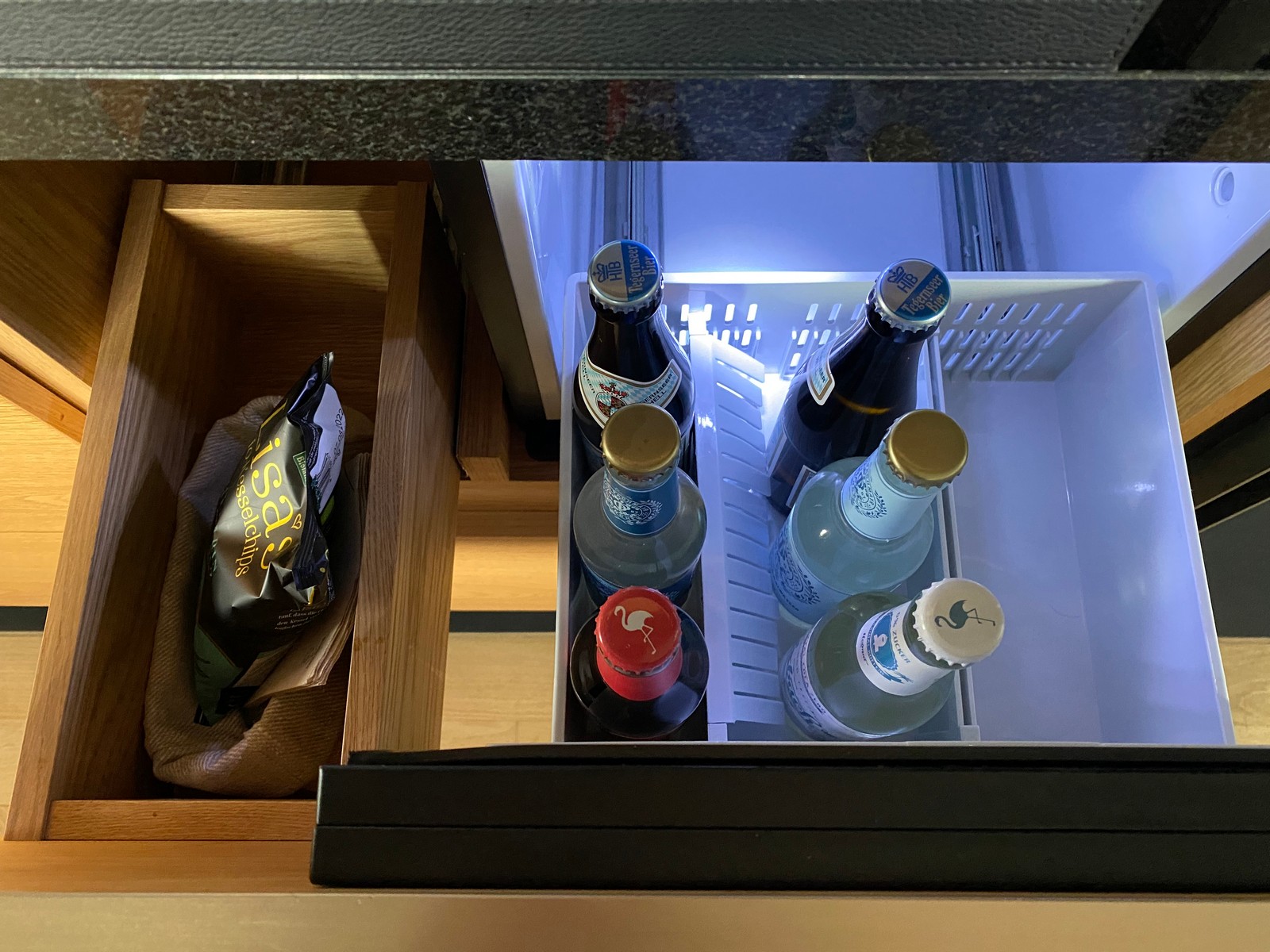 Das Zimmer bestand aus einem großen Raum mit Sitzgelegenheiten an beiden Fenstern. Wie erwähnt, ist die Größe dieser Zimmerkategorie von Vorteil, weil das Baby-Bett nicht mitten im Raum steht und wir den Hochstuhl bequem an die Stirnseite des Tischs stellen konnten. Hier haben wir dann auch unser Abendessen über den Room Service zu uns genommen, weil die spezielle Silvesterveranstaltung im Hotelrestaurant für uns nicht in Frage kam. Die Minibar mit mehreren alkoholfreien Getränken sowie einem Snack ist kostenfrei. Außerdem stehen ein Wasserkocher sowie eine Kaffeemaschine zur Verfügung. Teile des Badezimmers sind verglast. Wer will, kann dem Zimmerpartner also vom Bett aus beim Zähneputzen oder Händewaschen zuschauen. Allerdings kann auch ein Sichtschutz heruntergelassen werden.