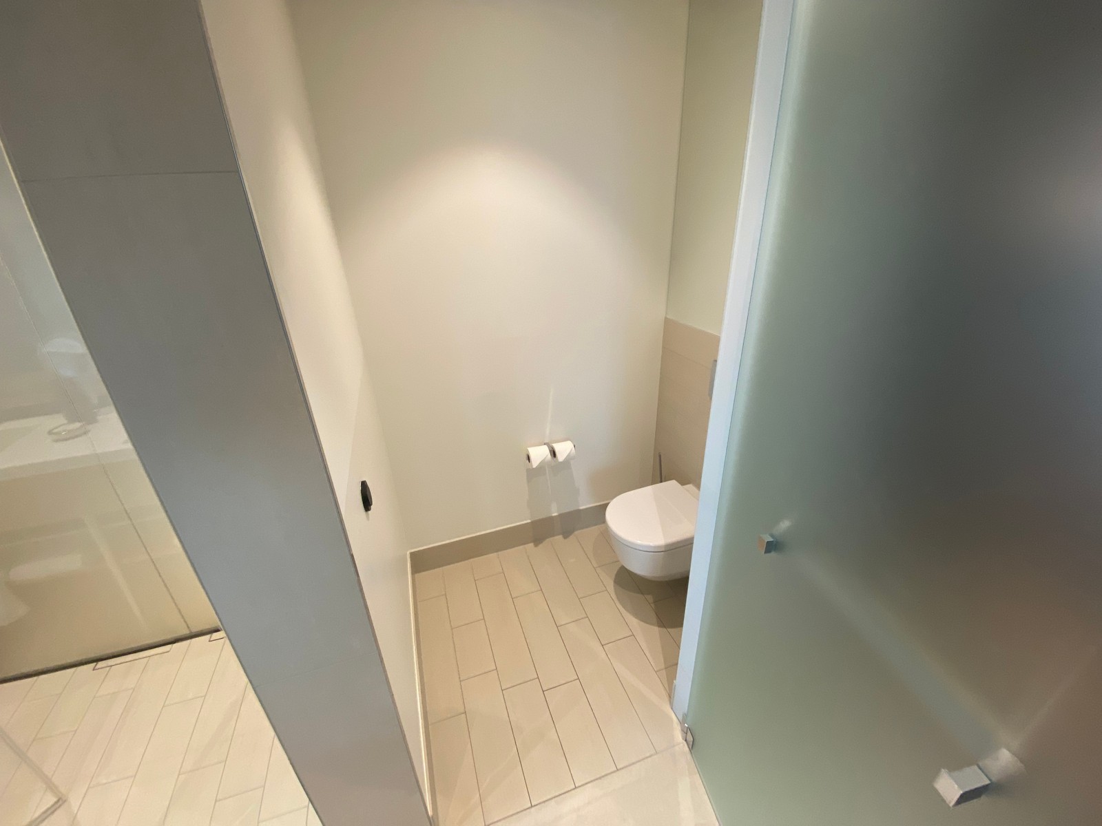 Der zweite, durch eine Flügeltür abgetrennte, Bereich war das Schlafzimmer mit einem 2×2 Meter großen Bett, einem direkt anschließenden Fernseher (hier fanden wir etwas schade, dass dieser die Sicht auf nach draußen etwas behinderte) sowie einem weiteren Tisch zum Arbeiten. Da sich die Suite außen befand, hatte man hier eine tolle Fensterfront über Eck und konnte so verschiedene Blickwinkel genießen. Durch Scheiben getrennt konnte man außerdem in das großzügige Badezimmer sehen. Es befanden sich dort zwei Waschbecken mit jeweils beleuchteten Spiegeln, eine Badewanne, eine große Dusche, eine separat abgetrennte Toilette sowie direkt angrenzend die Ankleide mit einem Einbauschrank. Das Badezimmer war von beiden Seiten des Bettes erreichbar und ebenfalls durch Flügeltüren abtrennbar.