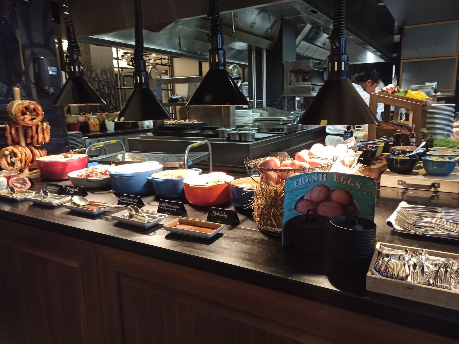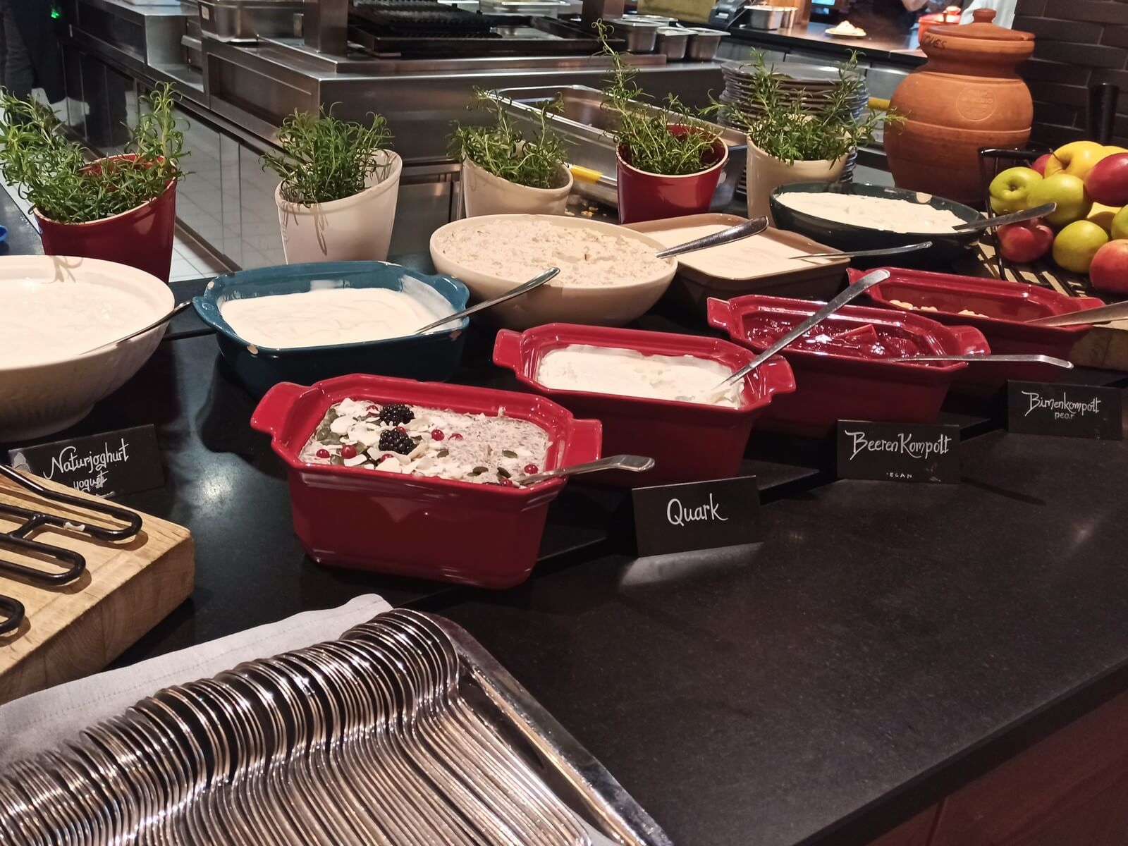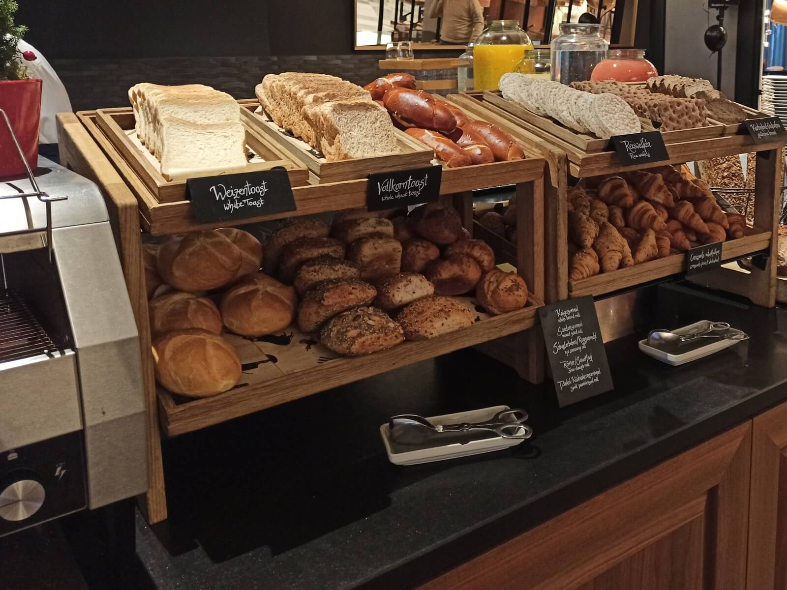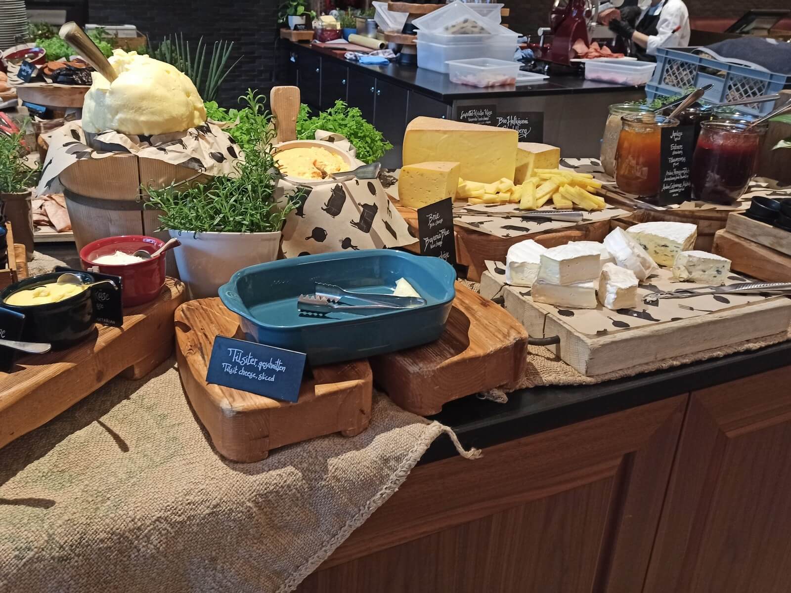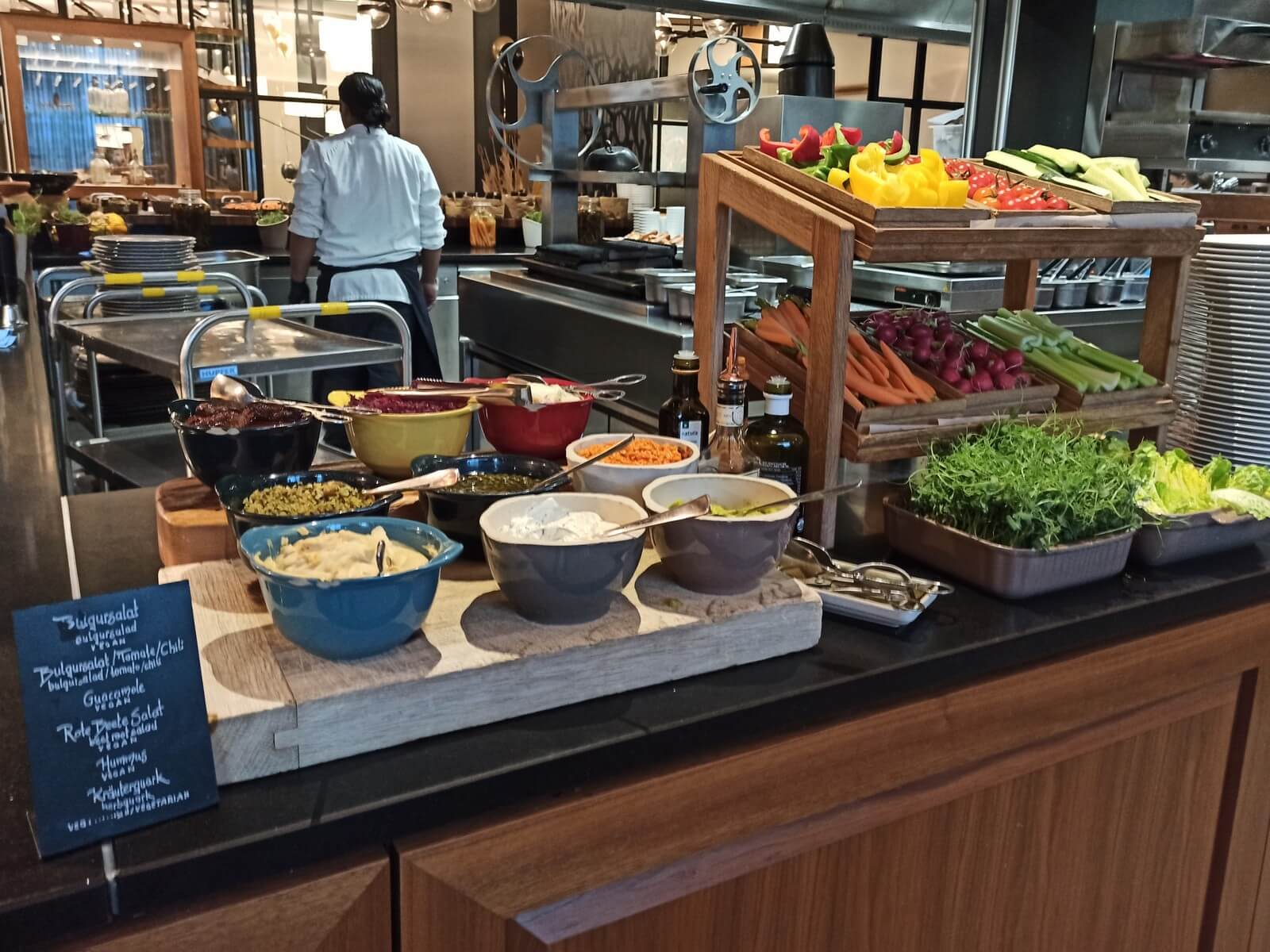 Das Frühstücksrestaurant hat eine angenehme Größe und teils abgetrennte Sitzecken, sodass man in Ruhe essen kann. Auch ein Außenbereich ist vorhanden und aufgrund der Lage weg von der Hauptstraße sicherlich angenehm nutzbar. Das Frühstücksangebot ist unserer Meinung nach überdurchschnittlich gut. Highlight war unter anderem eine große Schale mit frischen Beeren. Ansonsten wurde eine große Auswahl an Broten, Gebäck, Aufschnitt, Obst, Müslis usw. geboten. Auch eine kleine Ecke mit warmen Gerichten wie Bohnen, Speck und Shakshuka gab es. Natürlich durften in Bayern auch Brezeln und Weißwurst nicht fehlen. Neben dem Buffet gab es eine Karte, auf welcher man verschiedene Eierspeisen, Waffeln oder Porridge bestellen konnte. Das Personal war stets aufmerksam und mehr als freundlich.