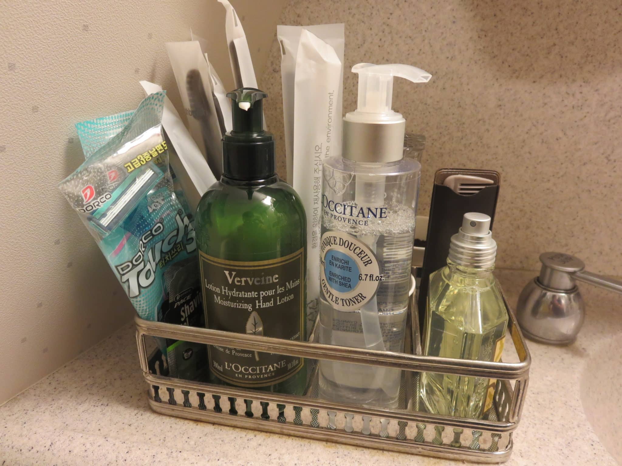Das Asiana Business Class Amenity Kit von L’Occitane enthielt Socken, Augenmaske, Ohrstöpsel, Zahnbürste und Zahnpasta, Taschentücher, sowie einen Kamm und enthielt damit alles Wesentliche. Hinzu kam dann noch ein Paar Slipper.