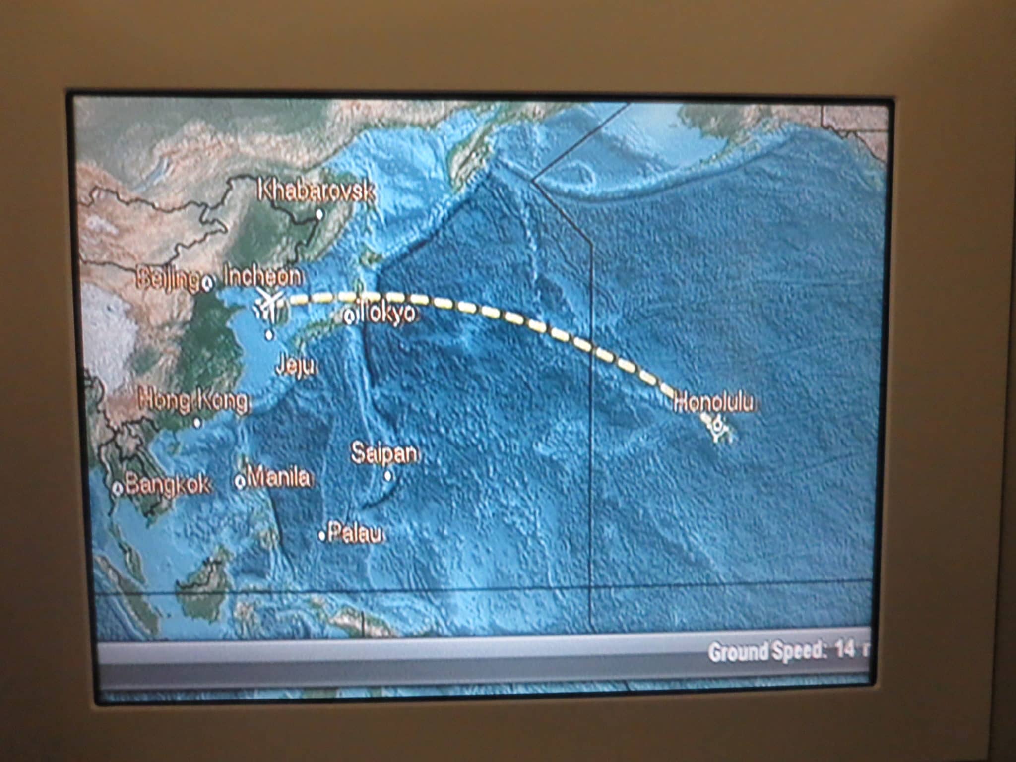 - Asiana Business Class (Boeing 777): Seoul Incheon 20:20 – Honolulu 10:10 (Flugzeit 08:50 Stunden)