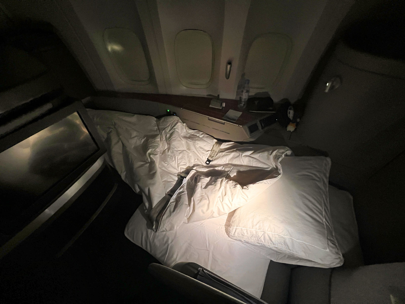Das Highlight dürfte der Sitz im Bettmodus sein, da es enorm breit ist und erst bei den Füßen schmaler wird, allerdings so, dass es nicht weiter stört und man in jeglichen Positionen schlafen kann. Nach dem Essen habe ich mich umgezogen und die Flugbegleiter darum gebeten mir das Bett zu richten. Hierbei gibt es eine Matratzenauflage sowie vollwertige Bettwaren, so dass es sich äußerst komfortabel in 30.000 Fuß Höhe schlafen lässt.