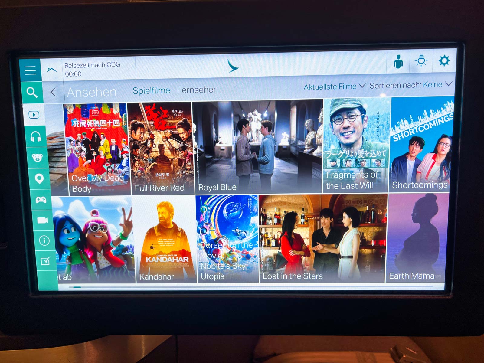 Der Monitor lässt sich wahlweise via Touchscreen oder die seitliche IFE Fernbedienung steuern. Die Bedienung läuft flüssig und die Film- und Serienauswahl kann sich durchaus sehen lassen. Man kommt nicht an Emirates oder Singapore Airlines ran, allerdings ist man beispielsweise deutlich besser aufgestellt als Swiss, Lufthansa oder Japan Airlines, sodass man keine Probleme haben sollte etwas Passendes zu finden.