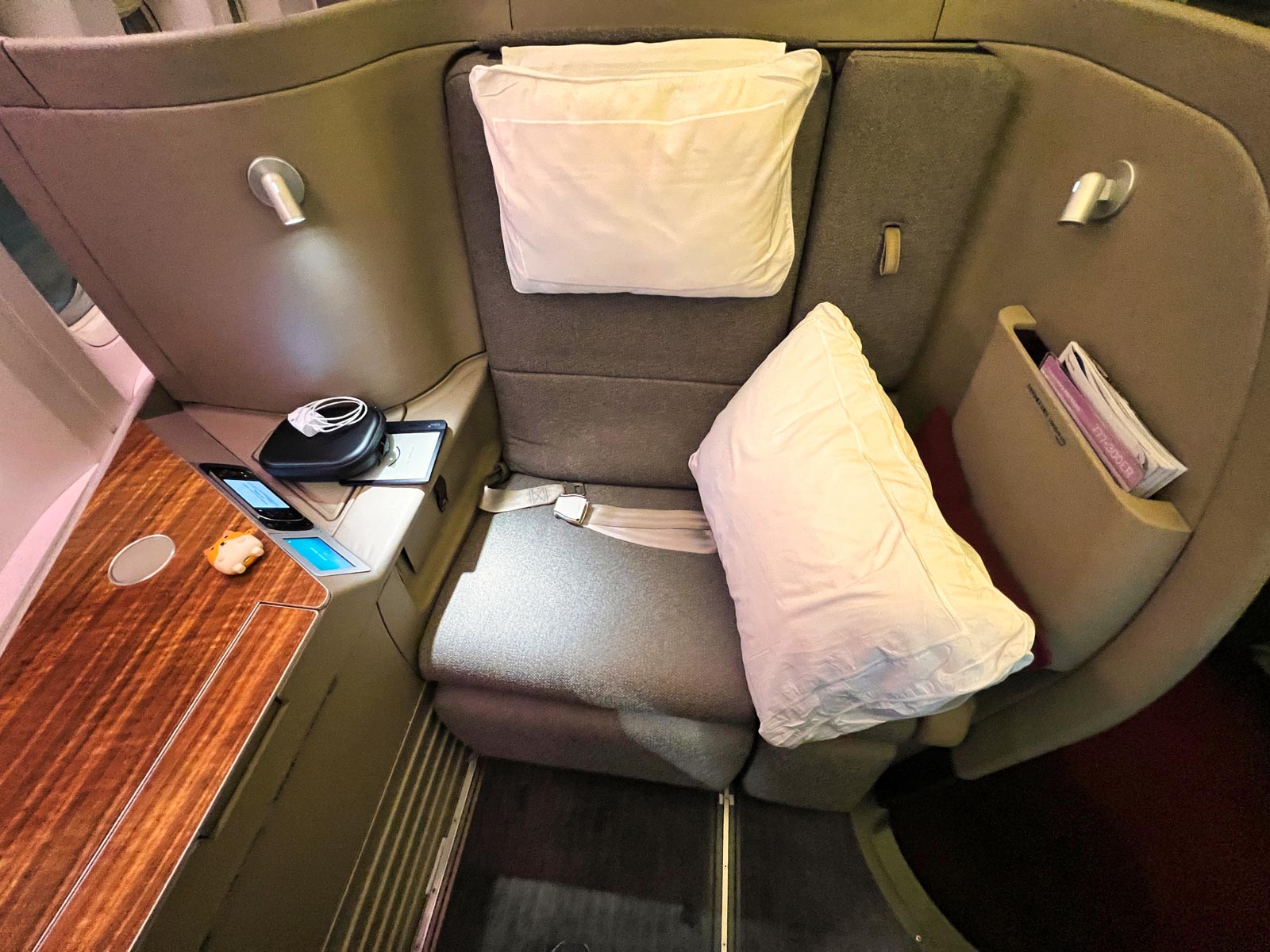 Insgesamt gefällt mir der Sitz der Cathay Pacific First Class wirklich gut. Die Sitze sind groß, bequem und trotz ihres Alters in einem tadellosen Zustand, was grundsätzlich für die gesamte Kabine gilt. Eine Türe habe ich hier definitiv nicht vermisst, und auch sonst ist das Design wirklich einzigartig.