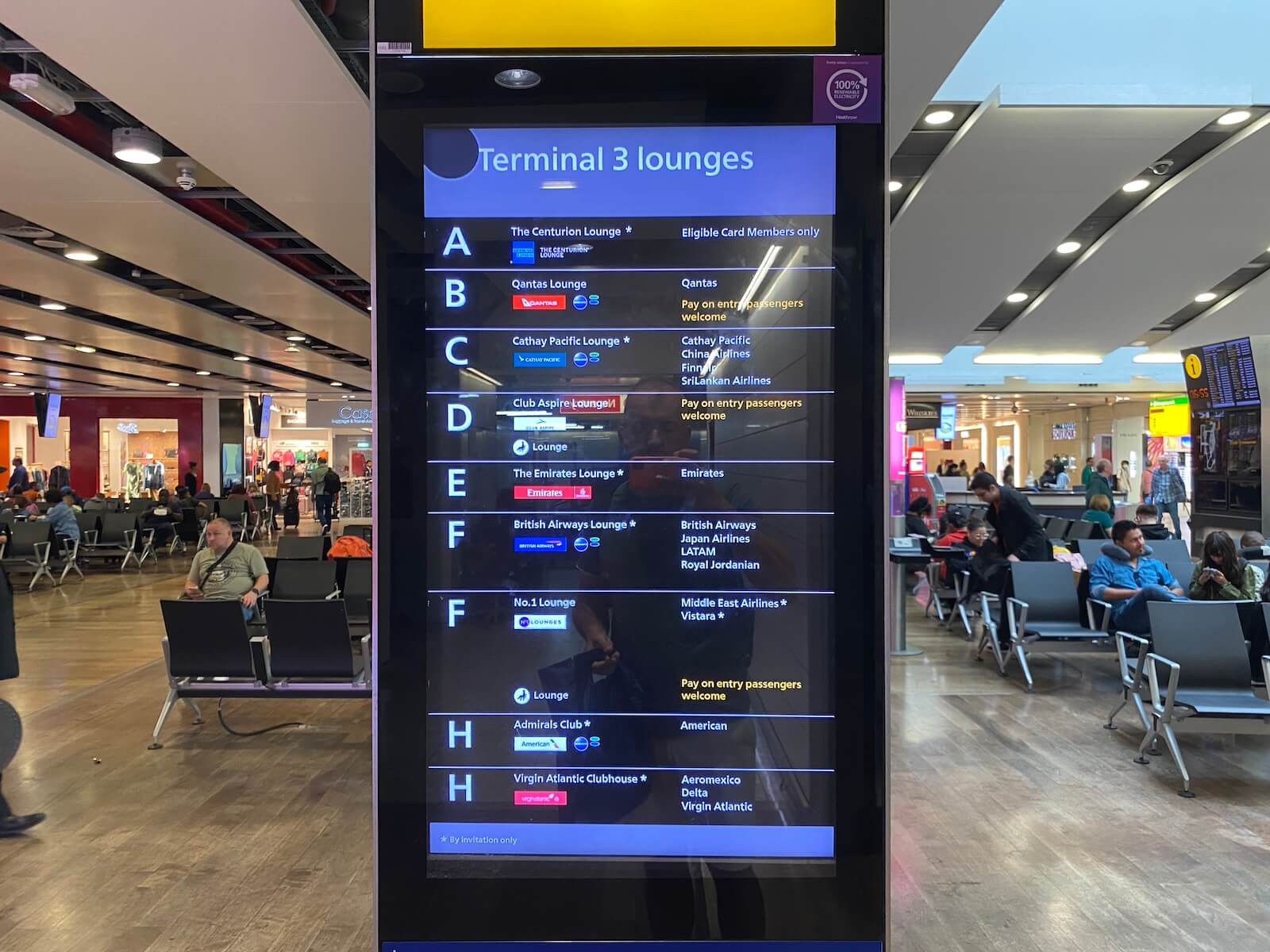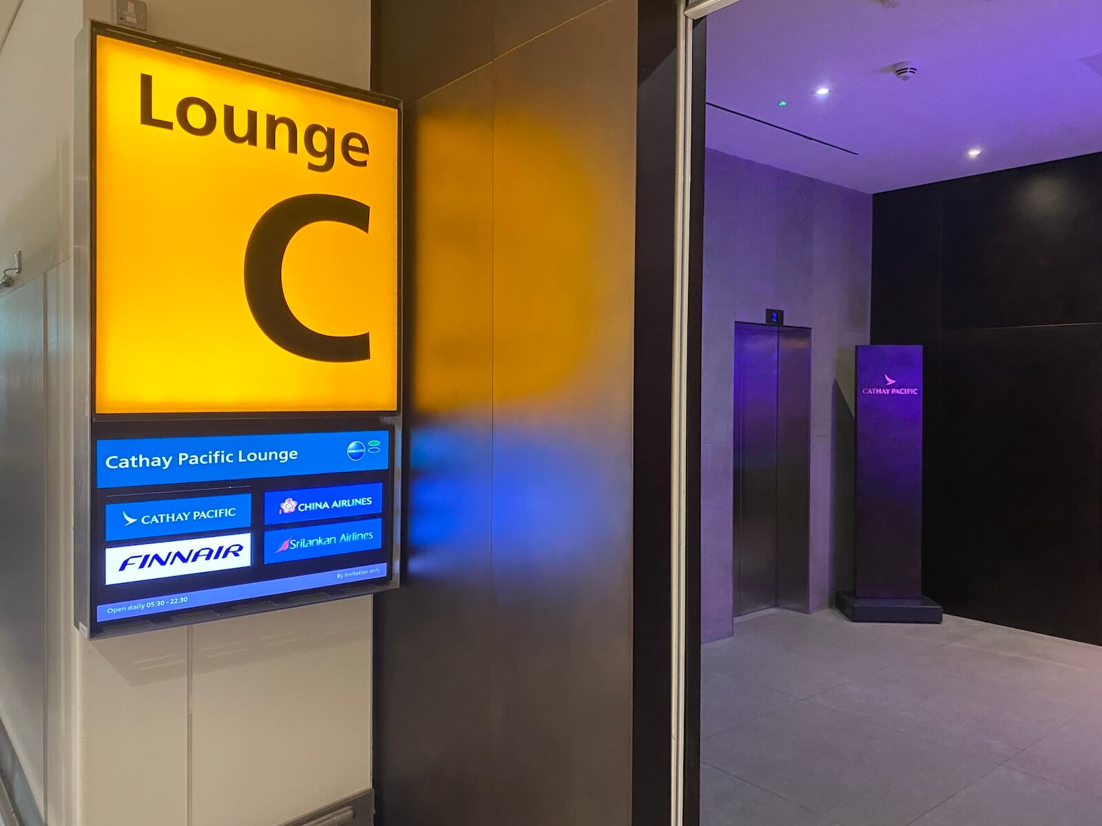 Die Cathay Pacific Lounge befindet sich wie alle anderen oneworld Lounges in Terminal 3 und liegt direkt neben der Qantas Lounge. Die Lounges in Terminal 3 sind alle mit einem großen Buchstaben gekennzeichnet. Passend zu Cathay hat die Lounge den Buchstaben C. Checkt ihr ganz normal am Counter der Airlines ein und geht durch die Sicherheitskontrolle, steht ihr im Shopping-Bereich des Terminals. Dort findet sich eine große Auflistung aller Lounges. Folgt den Schildern an der Decke zu den Lounges B – H. Biegt vor Qantas Lounge rechts ab und ihr seht den Eingangsbereich zu den Cathay Pacific Lounges.