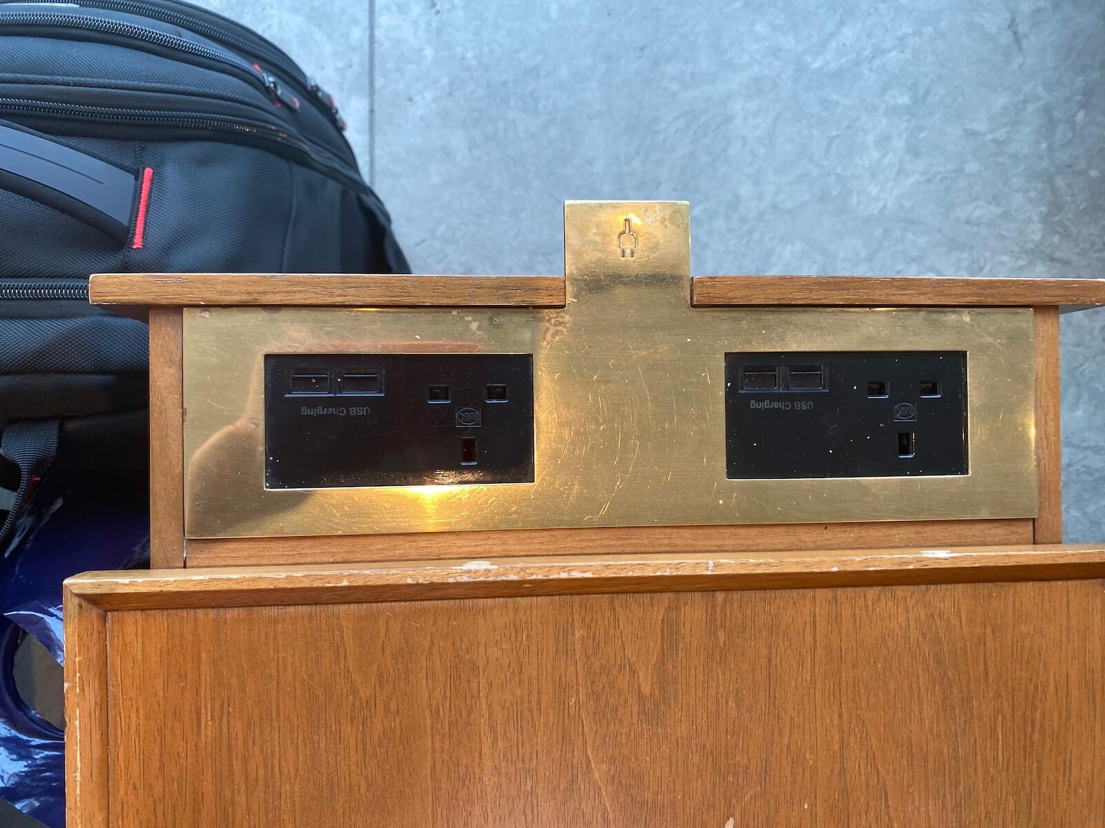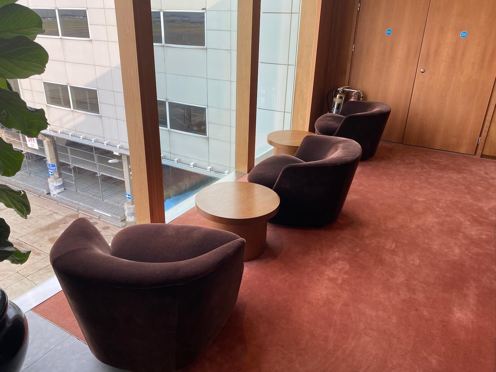 Im zweiten Sitzbereich, welcher vom ersten durch einen Paravent getrennt ist, steht die Bar zur Selbstbedienung und es gibt weitere Sitzmöglichkeiten mit Blick auf das Rollfeld. Die Sessel an der Fensterfront haben alle einen kleinen Beistelltisch, wo die USB-Anschlüsse und Steckdosen in der Schublade versteckt sind. Mehr gibt es zur Ausstattung der Cathay Pacific First Class Lounge eigentlich nicht zu sagen, klein aber fein.