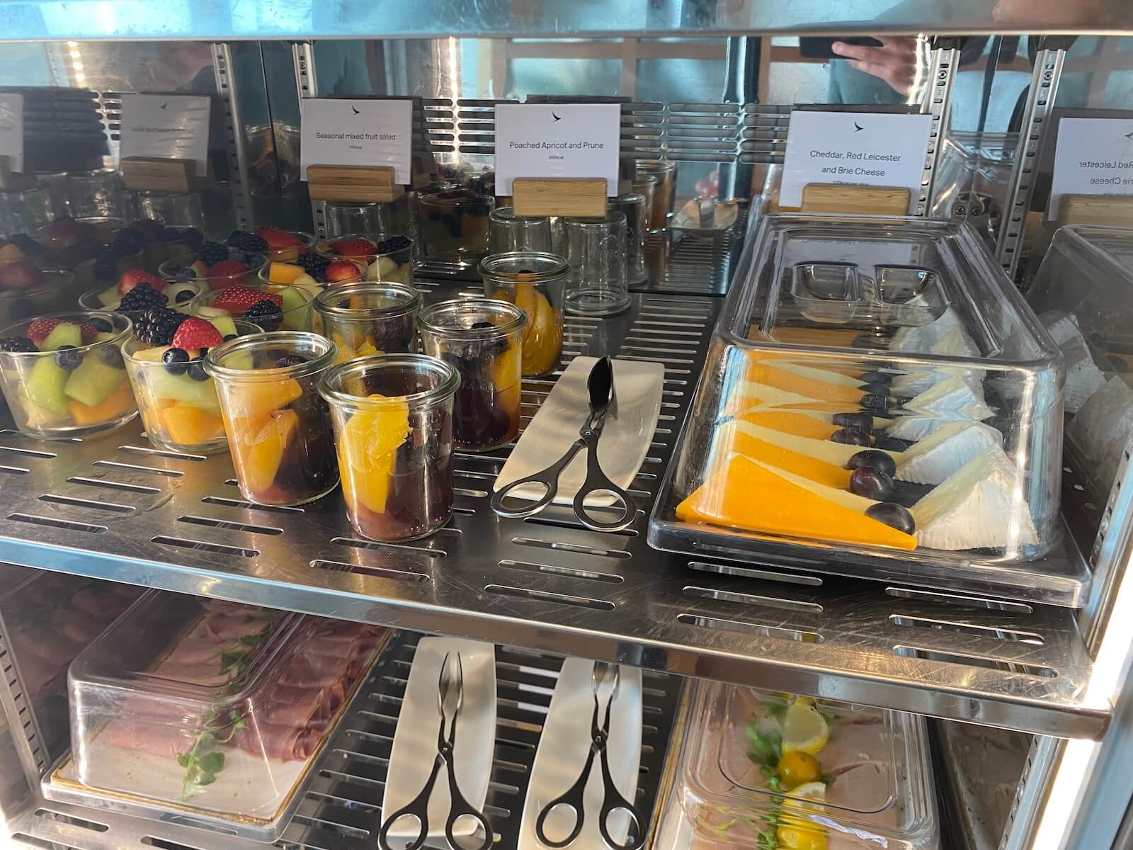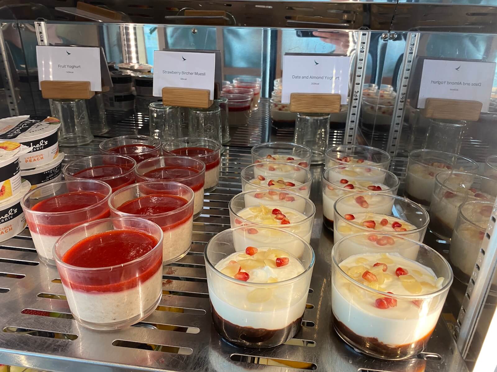 Im Vergleich zur American Airlines International First Class Lounge, in der ich zuvor war, konnte die Cathay Pacific Lounge sowohl im À-la-carte-Restaurant als auch beim Buffett überzeugen. Am Buffett gab es bereits belegte Croissants mit Bacon oder Käse, dazu Schoko-Croissants mit Pistazien und Erdbeerkuchen mit Pistazien. Hinzu kam die klassische Auswahl an Aufschnitt, Müslis und Joghurts.