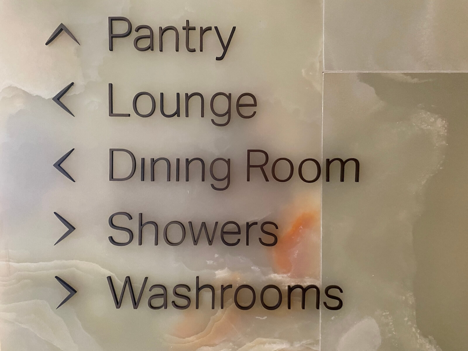 Mein Rückflug ab London erfolgte in der Business Class von Finnair, welche offiziell die Cathay Pacific Business Lounge als oneworld Partnerlounge nutzt. Der Zugang zur Cathay First Class Lounge war mir nur aufgrund meines Oneworld Emerald Status möglich. Der große Vorteil der Cathay Pacific Lounges ist, dass sich diese auf Ebene 2 befinden und somit einen perfekten Blick auf das Vorfeld bieten. Mit dem Fahrstuhl ging es also eine Etage nach oben, wo die Damen am Empfang mein Ticket überprüften und auf den Eingang der First Class Lounge deuteten. Den Flur weiter runter geht es rechts in die Business Class Lounge, geradeaus zu den Duschen und links zu den Toiletten, die gemeinsam von First und Business Class Passagiere genutzt werden.