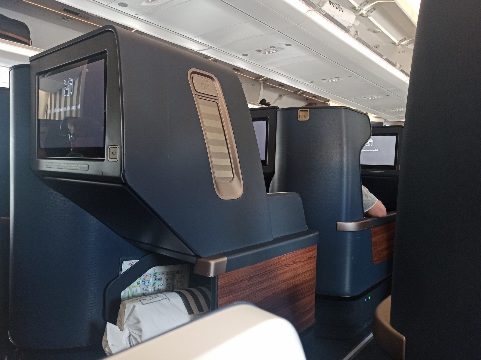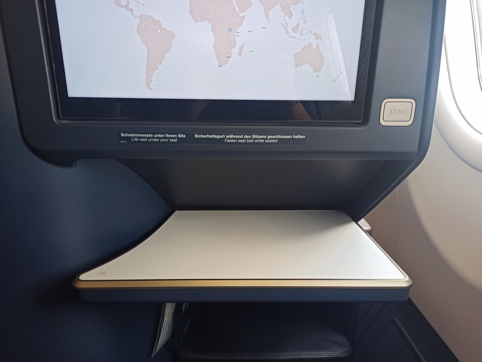 Nimmt man auf dem Sitz Platz, blickt man auf man den 17,3-Zoll-Bildschirm, der in der Verkleidung des Vordersitzes angebracht ist. Zwischen dem Bildschirm und dem Zugang zum Gang ist ein Kleiderhaken angebracht. Zwischen Kleiderhaken und Monitor ist genug Freiraum, sodass ein aufgehängtes Kleidungsstück nicht den Monitor verdeckt. Am unteren Rand des Monitors befindet sich der Knopf zum Ausklappen des Tisches. Ist der Tisch ausgeklappt, lässt er sich ausfahren, jedoch nicht horizontal verstellen. Der Tisch ist groß genug für einen Laptop. Unterhalb des Tisches ist der Raum und die Ablage für die Füße. Darunter befindet sich ein sehr kleiner Stauraum. Allerdings passen hier bspw. keine Schuhe hinein, was ihn etwas überflüssig macht.