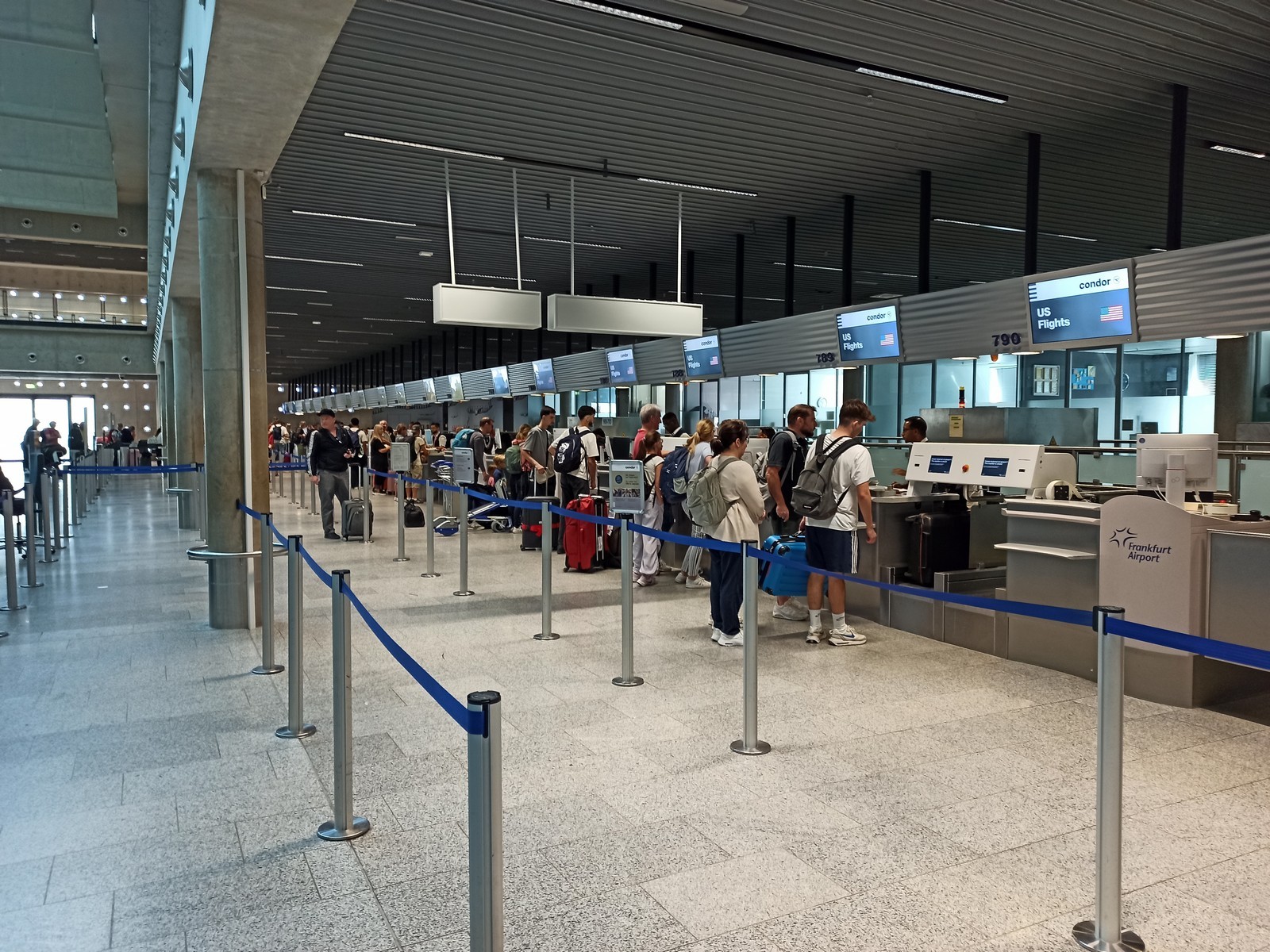Der Check-In-Bereich von Condor am Flughafen Frankfurt befindet sich in Halle C, im hintersten Bereich. Diesen Bereich hat die Airlines (fast) für sich alleine. Von Halle B kommend, befinden sich die Check-In-Schalter für die Business Class und Premium Economy Class links, und rechts folgen die Schalter der Economy Class. Noch weiter rechts schließen Schalter an, die speziell für Flüge in die USA vorgesehen sind. Diese habe ich jedoch übersehen und am Check-In-Counter für die Business Class mein Gepäck aufgegeben und meine Bordkarte erhalten. Der Mitarbeiter schickte mich dann noch kurz zur Dokumentenkontrolle zu den US-Schaltern. Dort wurde mein Rückflugticket sowie mein Esta kontrolliert, meine Bordkarte gestempelt und ich konnte mich zu den Non-Schengen-Gates im Bereich B aufmachen.