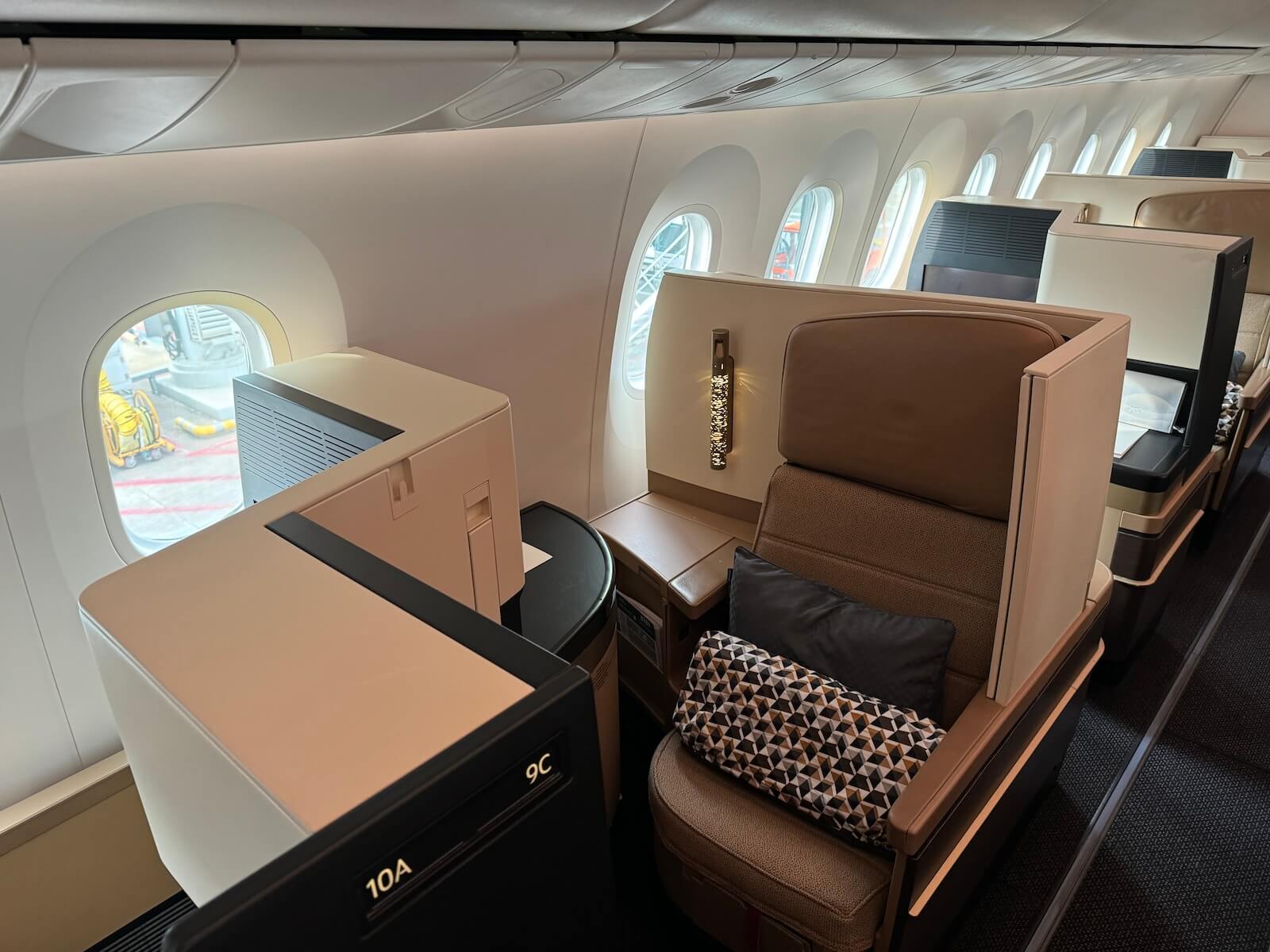 Das Boarding startete mit minimaler Verspätung und ich betrat das Flugzeug über die zweite Tür links. Alle Passagiere, Economy und Business Class, sollten über die gleiche Tür des Flugzeuges boarden. Die Stewardess empfing mich freundlich und zeigte mir meinen Sitz auf der linken Seite des Flugzeugs. Das Design der Kabine gefiel mir auf Anhieb sehr gut. Die Schalen der Sitze haben einen leichten Vanille-Farbstich und der Sitzbezug ist in einem hellen Braun gehalten. Neben jedem Sitz befindet sich eine schön verzierte Leselampe, die gerade bei einer dunklen Kabine eine angenehme Atmosphäre schaffen.