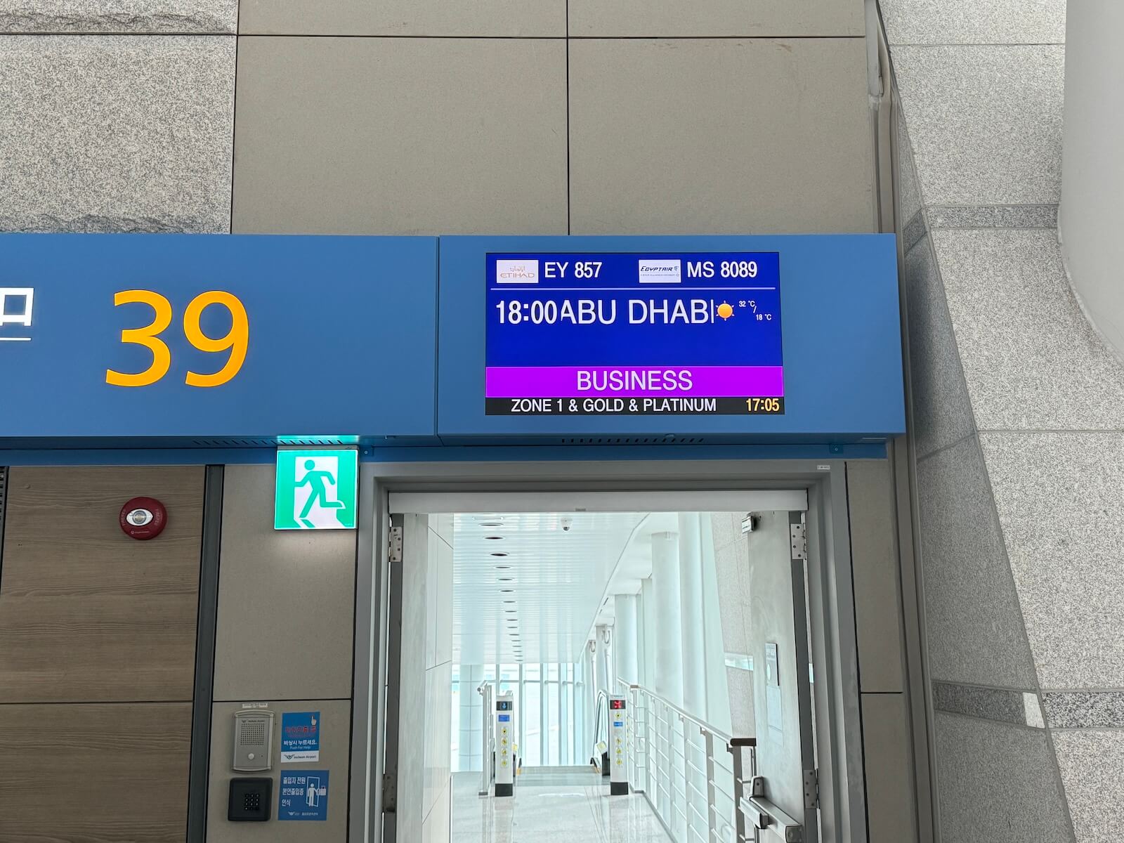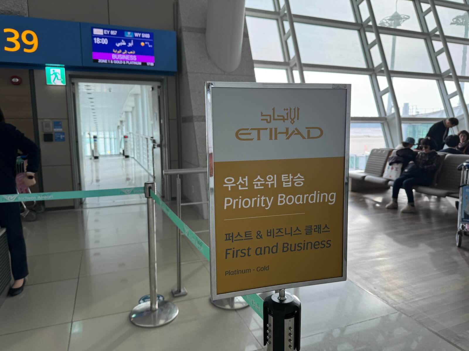 Die Zeit bis zum Abflug verbrachte in der Asiana Airlines Business Class Lounge West, die von Etihad Airways als Partnerlounge am Flughafen Seoul-Incheon genutzt wird. Von der Lounge ging es in ca. 5 bis 10 Minuten zu Fuß in Richtung Gate 39. Am Gate angekommen hatte das Boarding noch nicht begonnen, sodass sich in der Schlange für das Priority-Boarding noch kein Fluggast eingereiht hatte. Ich war also wieder der Erste, was mir ermöglichte Bilder ohne andere Passagiere von der Kabine zu schießen.