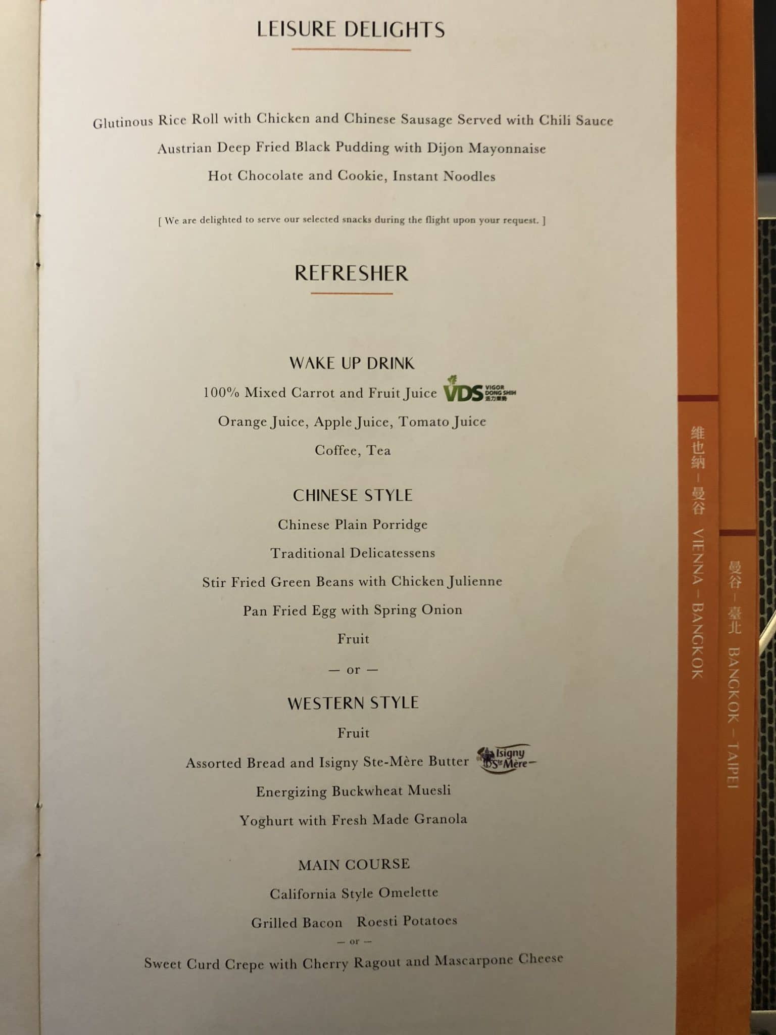 Der Rückflug startete um 22:35 Uhr ab Taipeh und sollte gegen 01:00 in Bangkok sein. Da ich bereits vorher in der Lounge etwas gegessen hatte, verzichtete ich auf diesem Flug auf das Essen. Das gleiche galt für den Langstreckenflug von Bangkok nach Wien. Ich fragte, ob ich nach dem Start eine Matratze bekommen könnte um mich direkt schlafen zu legen. Ich musste gar nicht bis nach den Start warten, sondern bekam diese noch vor dem Start auf meinen Sitz gelegt. Ich entschied mich dann lediglich für das Frühstück vor der Ankunft in Wien. Das waren Poached Eggs.