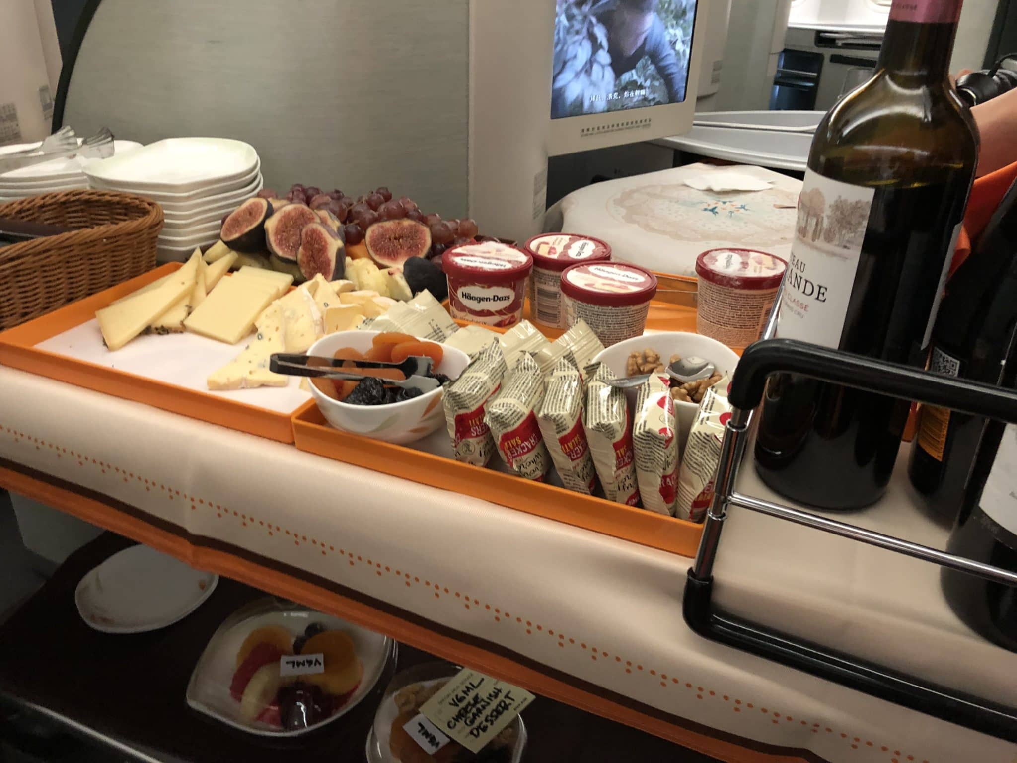 Was ich wirklich klasse fand, war, dass während der ganzen Zeit, eine Stewardess regelmäßig anwesend war und guckte ob sie etwas abräumen konnte, oder ob jemand noch etwas zu trinken haben möchte. Es wirkte auch keinesfalls störend und war für mich nur ein Zeichen von aufmerksamen Service. Das gehört wohl zum Standard und war auf allen unseren Flügen mit EVA Air der Fall. Der Nachtisch wurde auf einem kleinen Speisewagen durch die Kabine gefahren und man konnte sich zwischen Früchten, Eis, Käseplatte oder Schokobombe entscheiden.