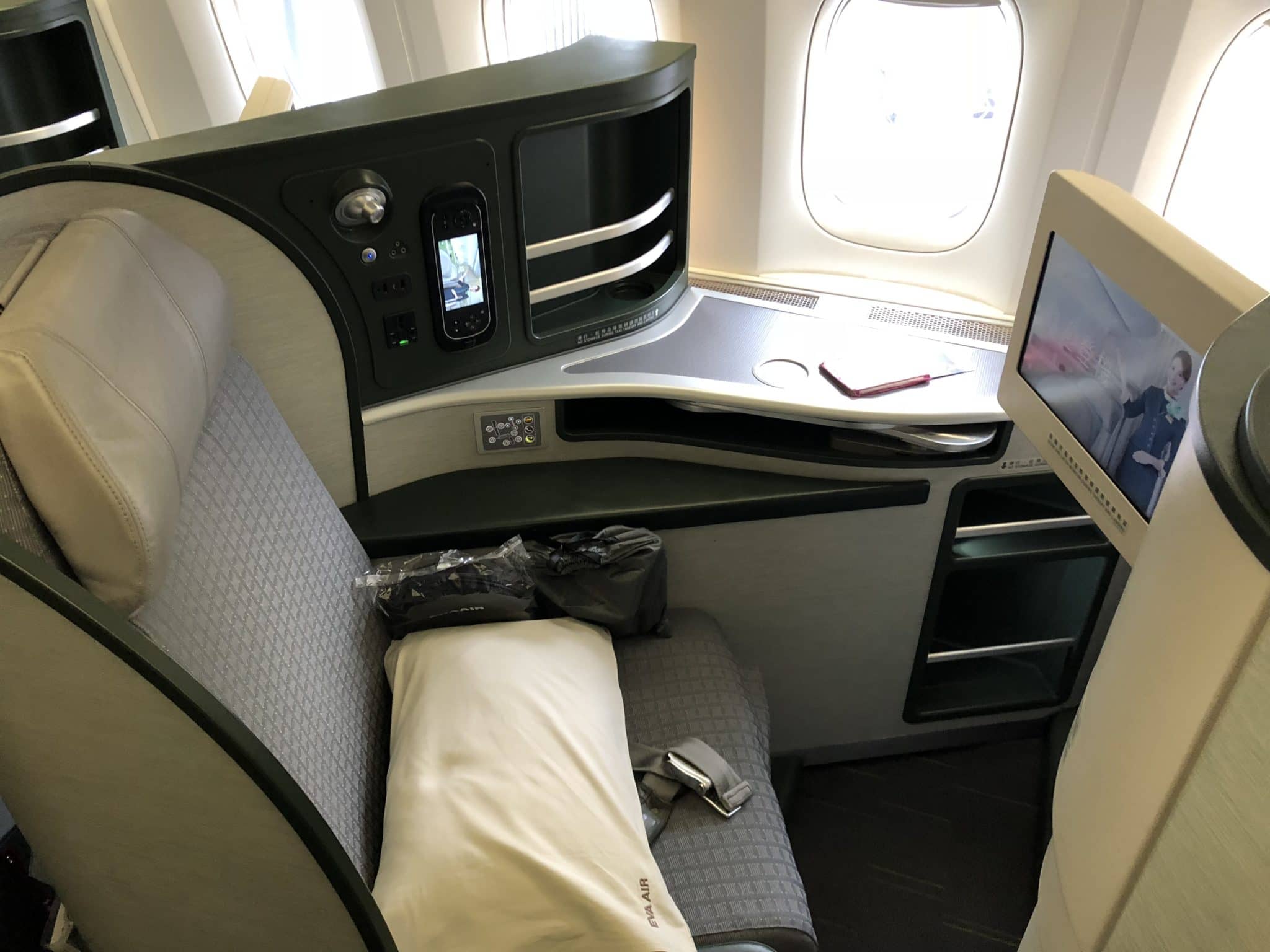 Wir sind mit EVA Air sowohl von Wien nach Taipei geflogen, als auch wieder zurück von Taipei nach Wien. Ich werde in diesem Review auf beide Flüge eingehen und keinen separaten Review zum zweiten Flug machen. Stattdessen werde ich lediglich auf die Unterschiede eingehen, die mir beim Rückflug aufgefallen sind. Auf dem Hinflug saß ich im hinteren Teil der Business Class, auf Platz 10A. Diesen empfand ich als sehr angenehm, da die Kabine nicht komplett ausgebucht war und es ein wenig ruhiger war als im großen vorderen Teil der Business Class. Beim Einsteigen kommen natürlich noch die Gäste der Premium Economy Class und der Economy durch diesen Teil des Flugzeugs, aber sind diese erst einmal alle geboarded, kann man sich entspannt zurücklehnen.