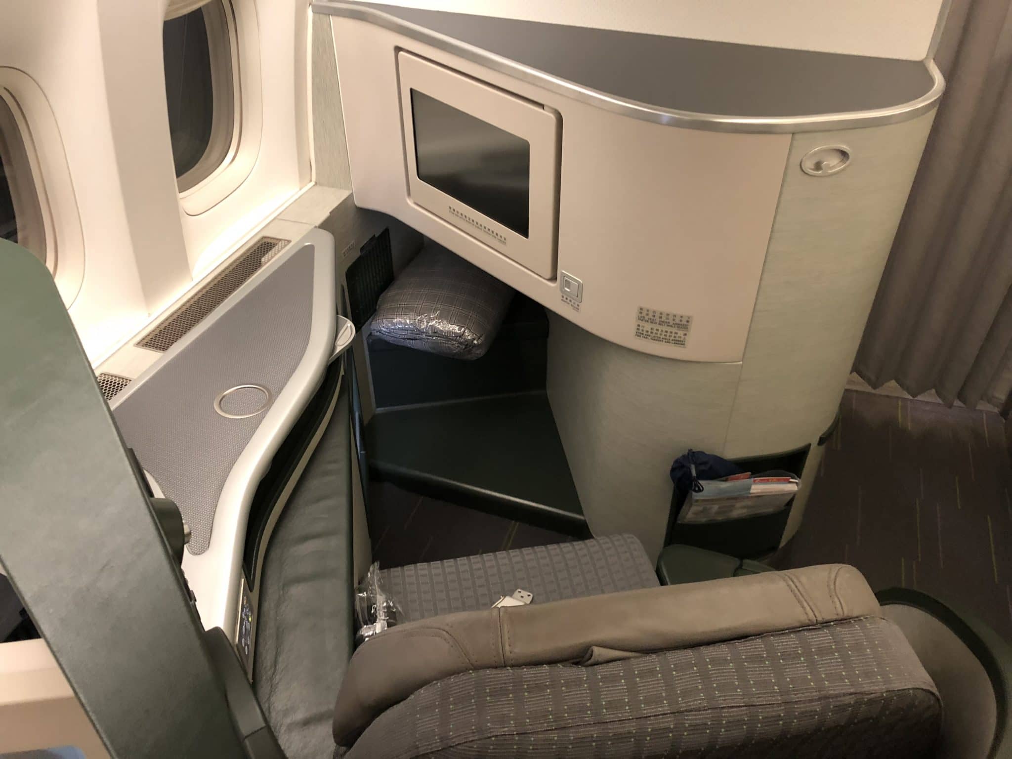 Darüber befinden sich zwei USB-Anschlüsse, eine Steckdose (die aber irgendwie nicht funktionierte), eine Leselampe und der Controller/Fernbedienung. Direkt daneben ist eine größere Ablagefläche und ein Stauraum für bspw. ein Ipad oder ein Buch. Unten am Sitz ist ein weiteres größeres Staufach, in dem man zum Beispiel gut ein Laptop unterbringen kann. Während Start und Landung durfte aber in beiden Fächern nichts verstaut werden. Der Monitor ließ sich aus der Ausgangsposition nach vorne ausklappen. Der Tisch war links von mir unter der Ablage verstaut und ließ sich relativ einfach aus- und wieder einfahren. Leider konnte man diesen aber nicht zu sich heranziehen, sodass man beim Essen den Sitz dementsprechend ausrichten sollte. Unten rechts am Sitz waren Bord Magazine und Slipper untergebracht. Oben rechts, am vorderen Sitz, war noch ein Haken für ein Sakko oder Ähnliches vorhanden. Unter der Fußablage vorne war leider keine Verstaumöglichkeit. So musste ich meine Schuhe davor positionieren, was aber auch nicht weiter störte.