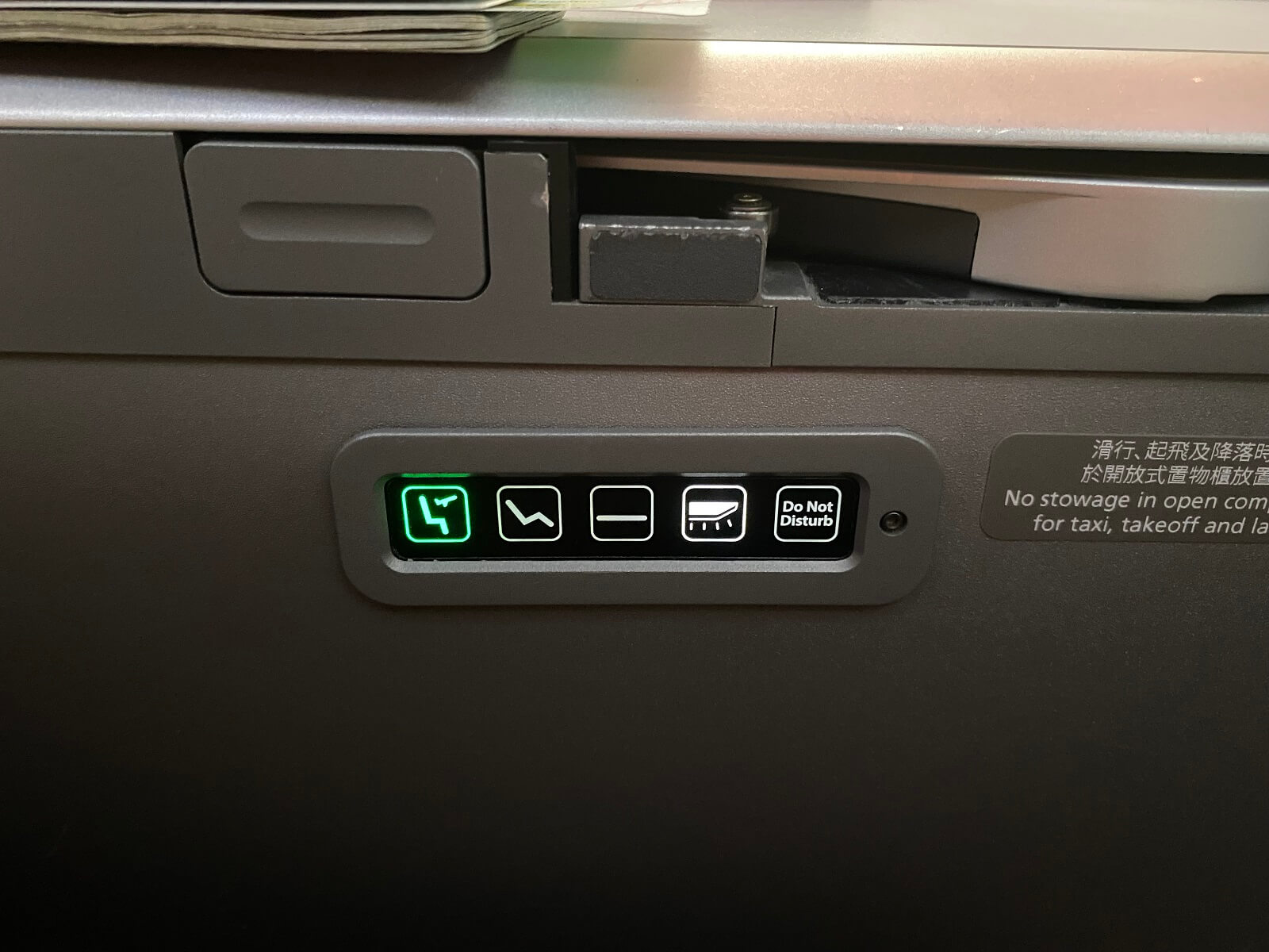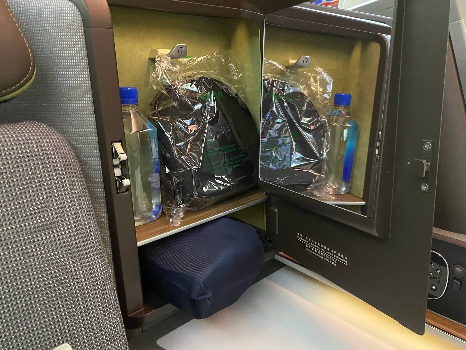 Am Ende der Ablagefläche wurde in der Sitzschale ein kleiner Stauraum für die Kopfhörer verbaut, die neben einem Fiji Wasser dort bereits zum Start des Fluges auslagen. Auf der Innenseite der Tür befindet sich ein Spiegel. An dem seitlichen Ende der Ablagefläche sind die Sitzeinstellungen, Steckdosen sowie der Inflight Entertainment Controller für den Monitor verbaut. Dieser hat ein kleines Farbdisplay auf dem sich separat vom Hauptmonitor ebenfalls Filme oder die Routenkarte öffnen lassen.