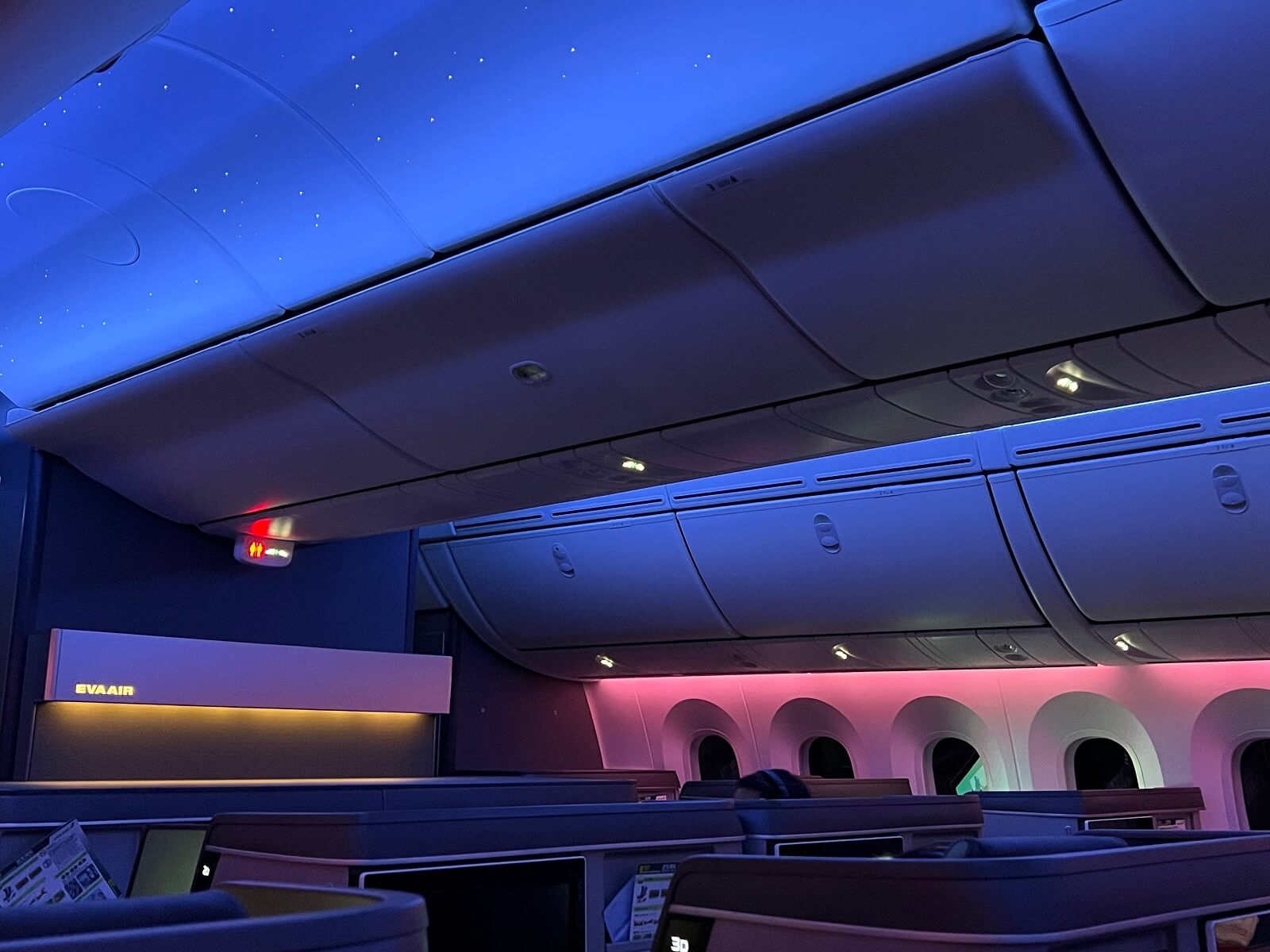 Im Gegensatz dazu sticht das Kabinenlicht während des Nachtfluges heraus. Mit den rosa und blauen Farbtönen und dem Sternenhimmel wurde meiner Meinung nach ein angenehmes Licht zur Entspannung gewählt. Auf Overhead Bins wurde in der Mitte der Business Class Kabine der 787-10 zwar nicht verzichtet, allerdings lassen die mittleren Overhead Bins durch ihre schmale Größe die Kabine nicht kleiner wirken.