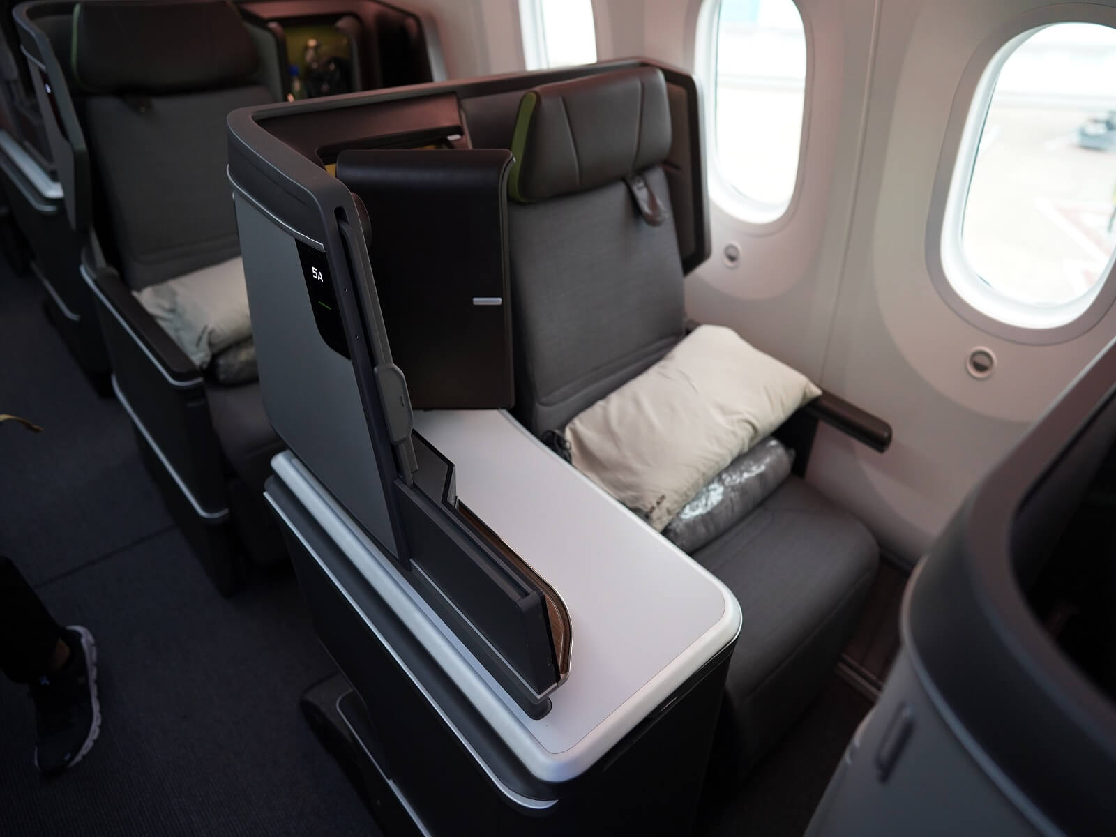 Im Vergleich zu anderen Airlines, welche oftmals eine Reverse Heringbone Konfiguration in ihrer Business Class verbaut haben, ist der Sitz bei EVA Air gerade in Flugrichtung ausgerichtet. Ich persönlich bevorzuge eine gerade Ausrichtung des Sitzes. Die Passagiere in einem Sitz mit einer ungeraden Nummer sitzen direkt am Fenster und die Ablagefläche befindet sich rechts, so dass zwischen Sitz und Gang noch eine kleine Trennung vorhanden ist, wohingegen auf den geraden Sitznummern die Ablagefläche am Fenster ist und somit dem Passagier direkten Zugang zum Gang gewährt. Ich persönlich empfinde dieses aber nicht als störend, da auf Kopfhöhe ein Sichtschutz verbaut ist, was einem lediglich die Sicht auf den Monitor des Sitznachbars ermöglicht. Die Ablagefläche in einem hellen Grauton gefällt mir ebenfalls, diese ist nicht verwinkelt und bietet genug Platz, um ein Buch, Notebook, Smartphone oder Tablet gleichzeitig zu platzieren.