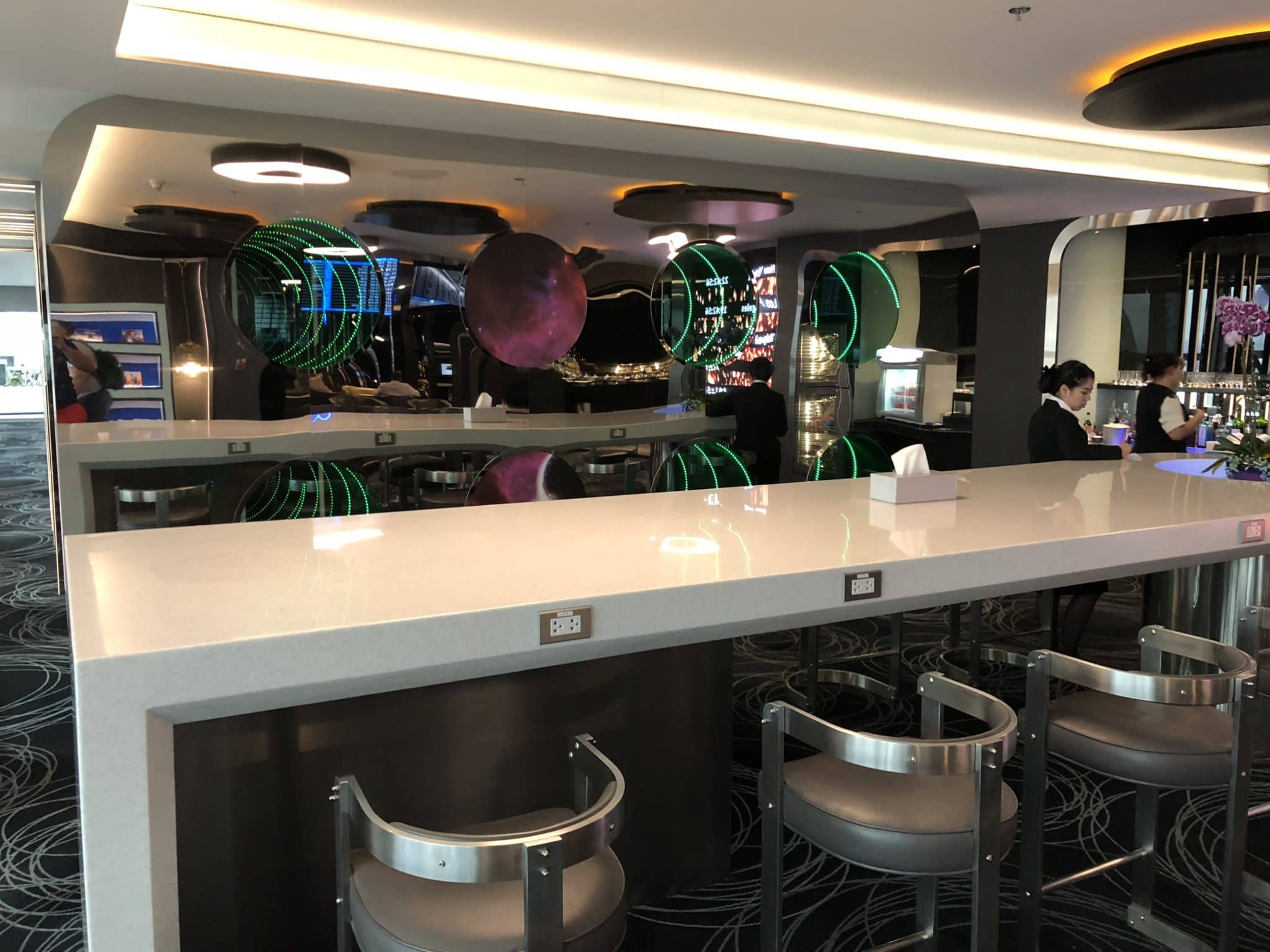 Die Ausstattung der EVA Air Lounge Bangkok wirkt modern, hip, versprüht aber auch ein wenig Charme der 80iger. Die Lounge wurde vor knapp 3,5 Jahren eröffnet und präsentiert sich immer noch in einem recht guten Zustand. Der Empfangsbereich ist ein wenig düster, ähnlich wie die Lounge, wo vieles in einem hellen und dunklen grau Ton gehalten ist. Neben dem Empfangsbereich steht ein großes EVA Air Modell-Flugzeug, wie man es auch aus den Air Canada Lounges kennt. Betretet ihr die Lounge befinden sich direkt auf der rechten Seite 3 Arbeitsplätze und kurz dahinter zwei Massagesessel. Im vorderen Teil der Lounge befinden sich Speisen und Getränke. Ausgestattet ist dieser Bereich mit Sesseln und Tischen, einfache Stühle gibt es in der Lounge nicht. Am hohen Tresen könnt ihr ebenfalls eine Mahlzeit zu euch nehmen. Durch die schrillen Farben in der Lounge fühlt man sich eher wie in einem Retro Restaurant als in einer Lounge. Im hinteren Bereich gibt es noch weitere Sitzmöglichkeiten in Form von bequemeren und größeren Sesseln.