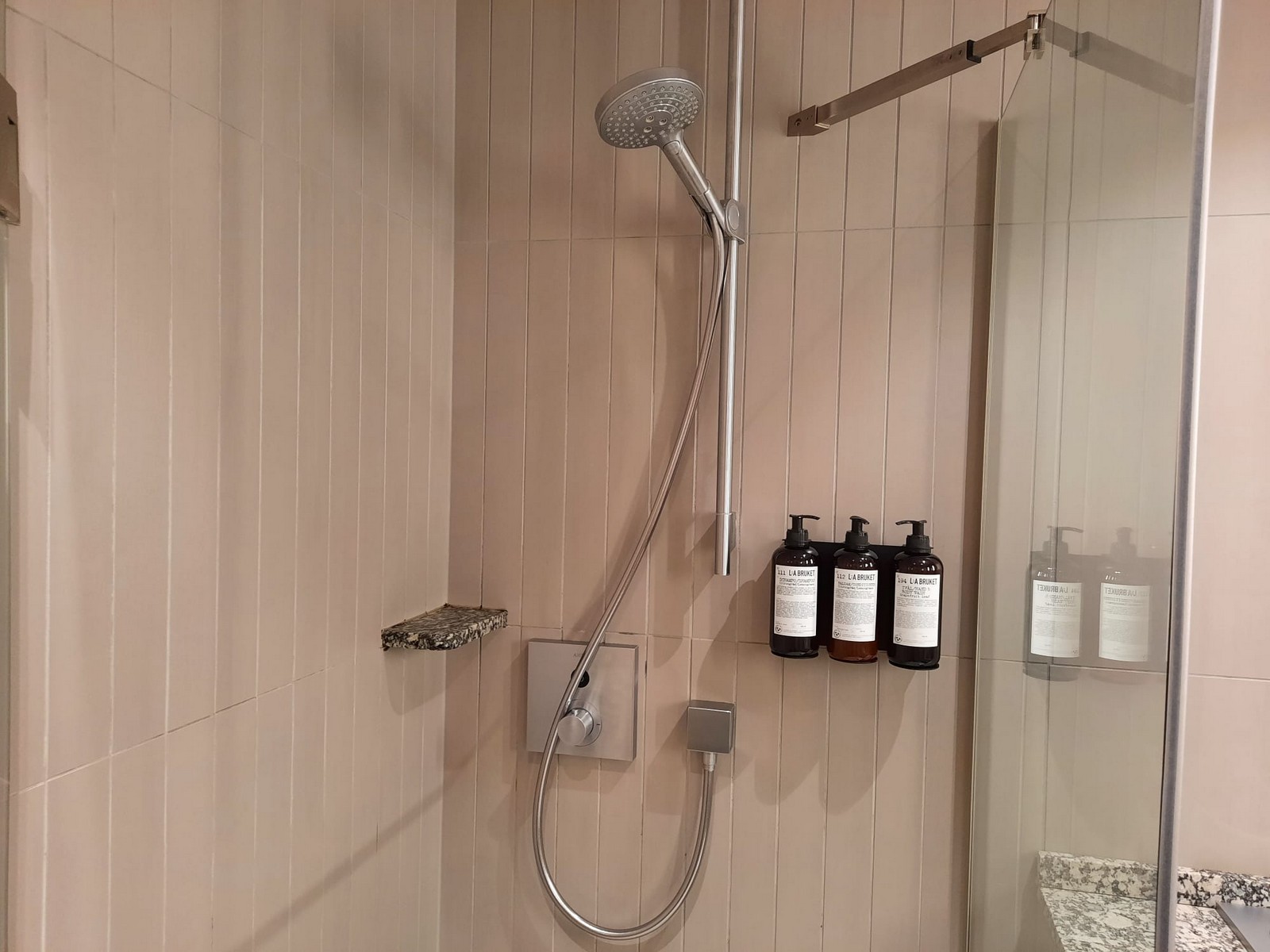 Auch die Duschen ließen sich während unseres Besuches problemlos nutzen. Eine Farbtafel neben jeder der 5 Duschkabinen zeigte an, ob diese frei war. Mit einem Tap auf das Display ließ sich die Kabine für 30 Minuten reservieren und die Anzeige sprang auf rot. Die Duschkabinen verfügten neben der eigentlichen Dusche über ein Waschbecken, Toilette und Waschbecken. Shampoo, Duschgel und Creme standen zur Verfügung und waren von La Bruket.